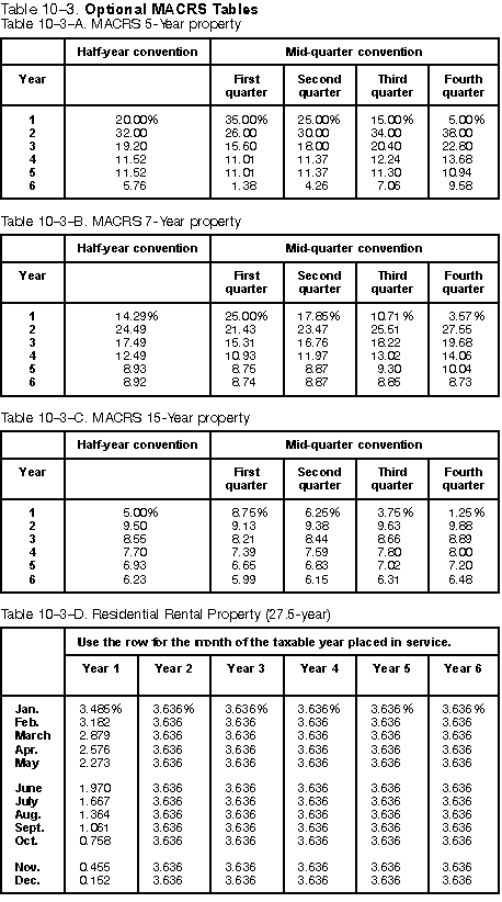 Table 10-3 Optional MACRS Tables Using the Optional TablesYou can use the tables in Table 10-3 to compute annual depreciation under MACRS. The tables show the percentages for the first 6 years. The percentages in Tables 10-3-A, 10-3-B, and 10-3-C make the change from declining balance to straight line in the year that straight line will yield a larger deduction. See Appendix A of Publication 946 for complete tables. If you elect to use the straight line method for 5-, 7-, or 15-year property, or the 150% declining balance method for 5- or 7-year property, use the tables in Appendix A of Publication 946. How to use the tables. The following section explains how to use the optional tables. Figure the depreciation deduction by multiplying your unadjusted basis in the property by the percentage shown in the appropriate table. Your unadjusted basis is your depreciable basis without reduction for depreciation previously claimed. Once you begin using an optional table to figure depreciation, you must continue to use it for the entire recovery period unless there is an adjustment to the basis of your property for a reason other than: