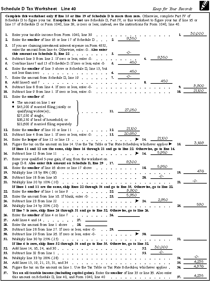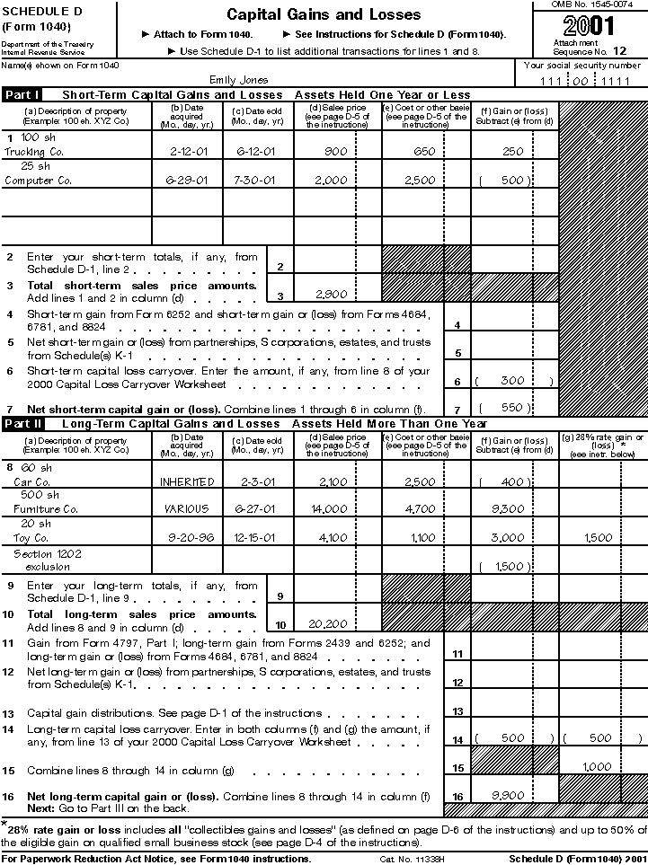 Comprehensive ExampleEmily Jones is single and, in addition to wages from her job, she has income from stocks and other securities. For the 2001 tax year, she had the following capital gains and losses, which she reports on Schedule D. All the Forms 1099 she received showed net sales prices. Her filled-in Schedule D is shown in this chapter. Capital gains and losses -- Schedule D. Emily sold stock in two different companies that she held for less than a year. In June, she sold 100 shares of Trucking Co. stock that she had bought in February. She had an adjusted basis of $650 in the stock and sold it for $900, for a gain of $250. In July, she sold 25 shares of Computer Co. stock that she bought in June. She had an adjusted basis in the stock of $2,500 and she sold it for $2,000, for a loss of $500. She reports these short-term transactions on line 1 in Part I of Schedule D. Emily had three other stock sales that she reports as long-term transactions on line 8 in Part II of Schedule D. In February, she sold 60 shares of Car Co. for $2,100. She had inherited the Car Co. stock from her father. Its fair market value at the time of his death was $2,500, which became her basis. Her loss on the sale is $400. Because she had inherited the stock, her loss is a long-term loss, regardless of how long she and her father actually held the stock. She enters the loss in column (f) of line 8. In June, she sold 500 shares of Furniture Co. stock for $14,000. She had bought 100 of those shares in 1990, for $1,000. She had bought 100 more shares in 1992 for $2,200, and an additional 300 shares in 1995 for $1,500. Her total basis in the stock is $4,700. She has a $9,300 ($14,000 - $4,700) gain on this sale, which she enters in column (f) of line 8. Because she held all 500 shares for more than 5 years, the entire gain is qualified 5-year gain. In December, she sold 20 shares of Toy Co. for $4,100. This was qualified small business stock that she had bought in September 1996. Her basis is $1,100, so she has a $3,000 gain which she enters in column (f) of line 8. Because she held the stock more than 5 years, she has a $1,500 section 1202 exclusion. She enters that amount in column (g) as a 28% rate gain and claims the exclusion on the line below by entering $1,500 as a loss in column (f). She received a Form 1099-B (not shown) from her broker for each of these transactions. Capital loss carryover from 2000. Emily has a capital loss carryover to 2001 of $800, of which $300 is short-term capital loss, and $500 is long-term capital loss. She enters these amounts on lines 6 and 14 of Schedule D. She kept the completed Capital Loss Carryover Worksheet in her 2000 Schedule D instructions (not shown), so she could properly report her loss carryover for the 2001 tax year without refiguring it. Tax computation. Because Emily has gains on both lines 16 and 17 of Schedule D and has taxable income, she goes to Part IV of Schedule D to figure her tax. But because line 15 of Schedule D is more than zero (due to her section 1202 gain from selling qualified small business stock), she must use the Schedule D Tax Worksheet to figure her tax instead. She must also complete the Qualified 5-Year Gain Worksheet (not shown) in her Schedule D instructions. After entering the gain from line 17 on line 13 of her Form 1040, she completes the rest of Form 1040 through line 39. She enters the amount from that line, $30,000, on line 1 of the Schedule D Tax Worksheet. After filling out the worksheet and the rest of that worksheet, she figures her tax is $4,235. This is less than the $4,876 tax she would have figured without the capital gain tax rates. Reconciliation of Forms 1099-B. Emily makes sure that the total of the amounts reported in column (d) of lines 3 and 10 of Schedule D is not less than the total of the amounts shown on the Forms 1099-B she received from her broker. For 2001, the total of each is $23,100. ScheduleSchedules (Form 1040): D D, page 1