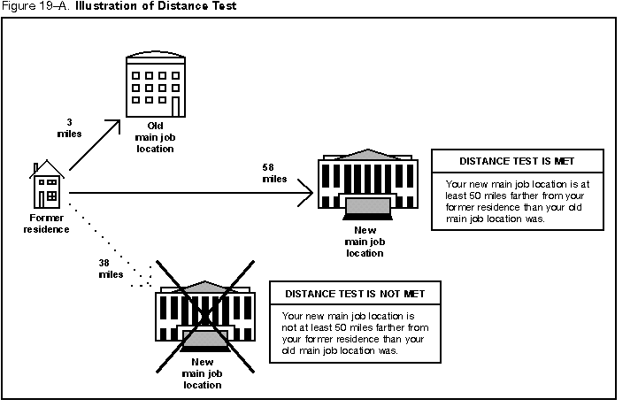 Retirees or survivors. You may be able to deduct the expenses of moving to the United States or its possessions even if the move is not related to the start of work at a new job location. You must have worked outside the United States or be a survivor of someone who did. See Retirees or Survivors Who Move to the United States, later. Home defined. Your home means your main home (residence). It can be a house, apartment, condominium, houseboat, house trailer, or similar dwelling. It does not include other homes owned or kept up by you or members of your family. It also does not include a seasonal home, such as a summer beach cottage. Your former home means your home before you left for your new job location. Your new home means your home within the area of your new job location. Distance TestYour move will meet the distance test if your new main job location is at least 50 miles farther from your former home than your old main job location was from your former home. For example, if your old main job location was 3 miles from your former home, your new main job location must be at least 53 miles from that former home. The distance between a job location and your home is the shortest of the more commonly traveled routes between them. The distance test considers only the location of your former home. It does not take into account the location of your new home. See Figure 19-A. Example. You moved to a new home less than 50 miles from your former home because you changed main job locations. Your old main job location was 3 miles from your former home. Your new main job location is 60 miles from that home. Because your new main job location is 57 miles farther from your former home than the distance from your former home to your old main job location, you meet the distance test. First job or return to full-time work. If you go to work full time for the first time, your place of work must be at least 50 miles from your former home to meet the distance test. If you go back to full-time work after a substantial period of part-time work or unemployment, your place of work must also be at least 50 miles from your former home. Exception for Armed Forces. If you are in the Armed Forces and you moved because of a permanent change of station, you do not have to meet the distance test. See Members of the Armed Forces, later. Main job location. Your main job location is usually the place where you spend most of your working time. If there is no one place where you spend most of your working time, your main job location is the place where your work is centered, such as where you report for work or are otherwise required to "base" your work. Union members. If you work for several employers on a short-term basis and you get work under a union hall system (such as a construction or building trades worker), your main job location is the union hall. More than one job. If you have more than one job at any time, your main job location depends on the facts in each case. The more important factors to be considered are: