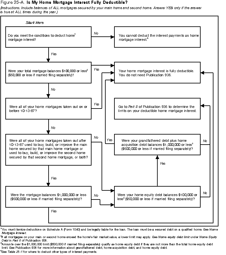 The dollar limits for the second and third categories apply to the combined mortgages on your main home and second home. See Part II of Publication 936 for more detailed definitions of grandfathered, home acquisition, and home equity debt. You can use Figure 25-A to check whether your home mortgage interest is fully deductible. Figure 25-A. Is My Interest Fully Deductible? Limits on deduction. You cannot fully deduct interest on a mortgage that does not fit into any of the three categories listed above. If this applies to you, see Part II of Publication 936 to figure the amount of interest you can deduct. Special SituationsThis section describes certain items that can be included as home mortgage interest and others that cannot. It also describes certain special situations that may affect your deduction. Late payment charge on mortgage payment. You can deduct as home mortgage interest a late payment charge if it was not for a specific service performed in connection with your mortgage loan. Mortgage prepayment penalty. If you pay off your home mortgage early, you may have to pay a penalty. You can deduct that penalty as home mortgage interest provided the penalty is not for a specific service performed or cost incurred in connection with your mortgage loan. Sale of home. If you sell your home, you can deduct your home mortgage interest (subject to any limits that apply) paid up to, but not including, the date of sale. Example. John and Peggy Harris sold their home on May 7. Through April 30, they made home mortgage interest payments of $1,220. The settlement sheet for the sale of the home showed $50 interest for the 6-day period in May up to, but not including, the date of sale. Their mortgage interest deduction is $1,270 ($1,220 + $50). Prepaid interest. If you pay interest in advance for a period that goes beyond the end of the tax year, you must spread this interest over the tax years to which it applies. You can deduct in each year only the interest that qualifies as home mortgage interest for that year. However, see Points, later. Mortgage interest credit. You may be able to claim a mortgage interest credit if you were issued a mortgage credit certificate (MCC) by a state or local government. Figure the credit on Form 8396, Mortgage Interest Credit. If you take this credit, you must reduce your mortgage interest deduction by the amount of the credit. For more information on the credit, see chapter 38. Ministers' and military housing allowance. If you are a minister or a member of the uniformed services and receive a housing allowance that is not taxable, you can still deduct your home mortgage interest. Mortgage assistance payments. If you qualify for mortgage assistance payments under section 235 of the National Housing Act, part or all of the interest on your mortgage may be paid for you. You cannot deduct the interest that is paid for you. No other effect on taxes. Do not include these mortgage assistance payments in your income. Also, do not use these payments to reduce other deductions, such as real estate taxes. Divorced or separated individuals. If a divorce or separation agreement requires you or your spouse or former spouse to pay home mortgage interest on a home owned by both of you, the payment of interest may be alimony. See the discussion of Payments for jointly-owned home in chapter 20. Redeemable ground rent. If you make annual or periodic rental payments on a redeemable ground rent, you can deduct them as mortgage interest. Payments made to end the lease and to buy the lessor's entire interest in the land are not ground rents. You cannot deduct them. For more information, see Publication 936. Nonredeemable ground rent. Payments on a nonredeemable ground rent are not mortgage interest. You can deduct them as rent if they are a business expense or if they are for rental property. Rental payments. If you live in a house before final settlement on the purchase, any payments you make for that period are rent and not interest. This is true even if the settlement papers call them interest. You cannot deduct these payments as home mortgage interest. Mortgage proceeds invested in tax-exempt securities. You cannot deduct the home mortgage interest on grandfathered debt or home equity debt if you used the proceeds of the mortgage to buy securities or certificates that produce tax-free income. Grandfathered debt and home equity debt are defined earlier under Amount Deductible. Refunds of interest. If you receive a refund of interest in the same tax year you paid it, you must reduce your interest expense by the amount refunded to you. If you receive a refund of interest you deducted in an earlier year, you generally must include the refund in income in the year you receive it. However, you need to include it only up to the amount of the deduction that reduced your tax in the earlier year. This is true whether the interest overcharge was refunded to you or was used to reduce the outstanding principal on your mortgage. If you received a refund of interest you overpaid in an earlier year, you generally will receive a Form 1098, Mortgage Interest Statement, showing the refund in box 3. For information about Form 1098, see Mortgage Interest Statement, later. For more information on how to treat refunds of interest deducted in earlier years, see Recoveries in chapter 13. PointsThe term "points" is used to describe certain charges paid, or treated as paid, by a borrower to obtain a home mortgage. Points may also be called loan origination fees, maximum loan charges, loan discount, or discount points. A borrower is treated as paying any points that a home seller pays for the borrower's mortgage. See Points paid by the seller, later. General rule. You generally cannot deduct the full amount of points in the year paid. Because they are prepaid interest, you generally must deduct them over the life (term) of the mortgage. Exception. You can fully deduct points in the year paid if you meet a