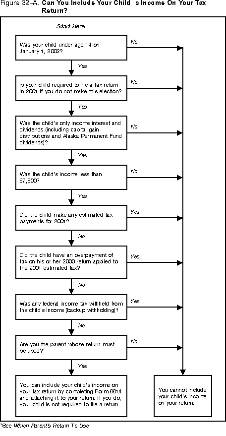 Figure 32–A. Can You Include Your Child's Income On Your Tax Return? How to make the election. Make the election by attaching Form 8814 to your Form 1040 or Form 1040NR. (If you make this election, you cannot file Form 1040A or Form 1040EZ.) Attach a separate Form 8814 for each child for whom you make the election. You can make the election for one or more children and not for others. Effect of Making the ElectionThe federal income tax on your child's income may be more if you make the Form 8814 election rather than file a return for the child. Rates may be higher. If you use Form 8814, the child's income may be taxed at a higher rate on your return than it would be on the child's own return. Deductions you cannot take. By making the Form 8814 election, you cannot take any of the following deductions the child would be entitled to on his or her return.