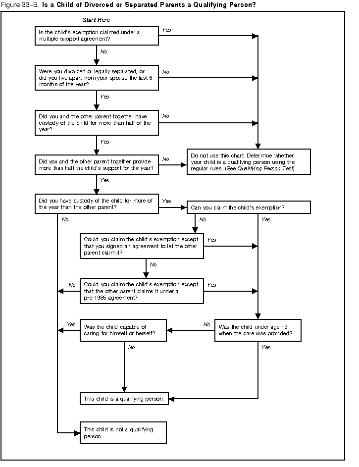 You can use Figure 33-B to see whether this exception applies to you. If it applies, only the custodial parent can treat the child as a qualifying person. If the exception does not apply, follow the regular rules for a qualifying person under Qualifying Person Test, earlier. Example. You are divorced and have custody of your 8-year-old child. You sign Form 8332 to allow your ex-spouse to take the exemption. You pay child care expenses so you can work. Your child is a qualifying person and you, the custodial parent, can claim the credit for those expenses, even though your ex-spouse claims an exemption for the child. Custodial parent. You are the custodial parent if, during the year, you have custody of your child longer than your child's other parent has custody. Divorced or separated. For purposes of determining whether your child is a qualifying person, you are considered divorced or separated if either of the following applies.