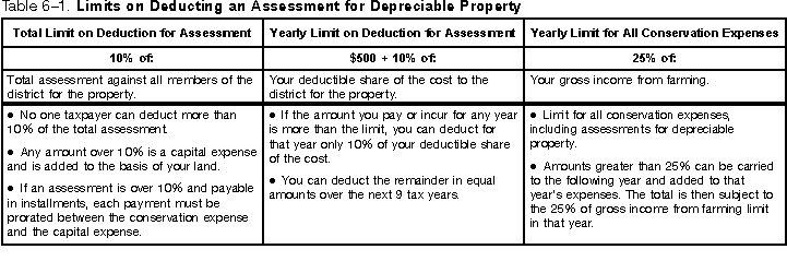 After you apply these limits, the amount you can deduct is added to your other conservation expenses for the year. The total for these expenses is then subject to the 25% of gross income from farming limit on the deduction, discussed later. See Table 6-1 for a brief summary of these limits. Total assessment limit. You cannot deduct more than 10% of the total amount assessed to all members of the conservation or drainage district for the depreciable property. This applies whether you pay the assessment in one payment or in installments. If your assessment is more than 10% of the total amount assessed, both the following rules apply.