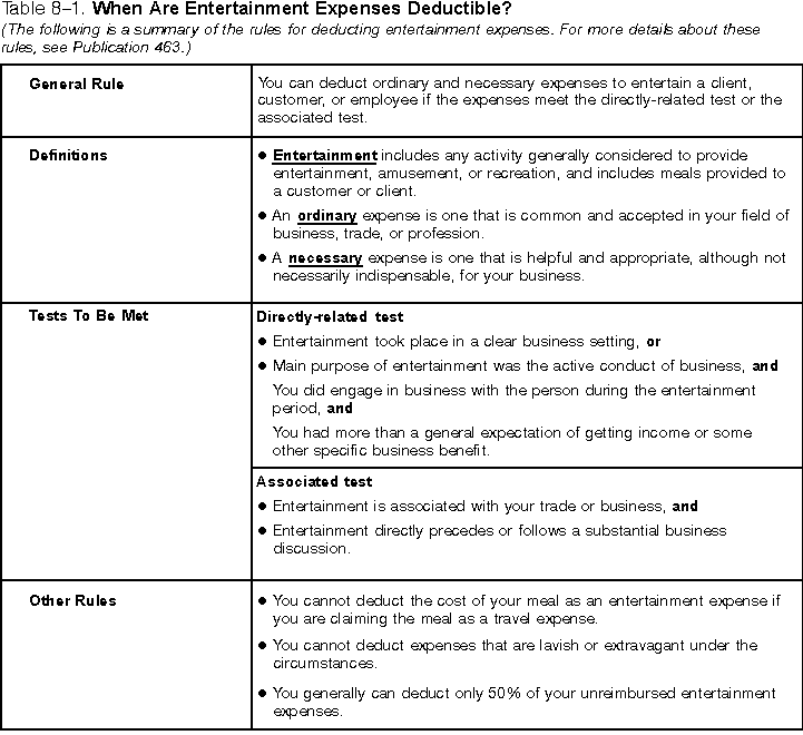 The following is a brief summary of the expenses you can deduct. Transportation. You can deduct the cost of travel by airplane, train, bus, or car between your home and your business destination. Taxi, commuter bus, and limousine. You can deduct fares for these and other types of transportation between the airport or station and your hotel, or between the hotel and your work location away from home. Baggage and shipping. You can deduct the cost of sending baggage and sample or display material between your regular and temporary work locations. Car or truck. You can deduct the costs of operating and maintaining your vehicle when traveling away from home on business. You can deduct actual expenses or the standard mileage rate (discussed earlier under Car and Truck Expenses), as well as business-related tolls and parking. If you rent a car while away from home on business, you can deduct only the business-use portion of the expenses. Meals and lodging. You can deduct the cost of meals and lodging if your business trip is overnight or long enough that you need to stop for sleep or rest to properly perform your duties. In most cases, you can deduct only 50% of your meal expenses. Cleaning. You can deduct the costs of dry cleaning and laundry while on your business trip. Telephone. You can deduct the cost of business calls while on your business trip, including business communication by fax machine or other communication devices. Tips. You can deduct the tips you pay for any expense in this list. More information. For more information about travel expenses, see Publication 463, Travel, Entertainment, Gift, and Car Expenses. Entertainment expenses. You may be able to deduct business-related entertainment expenses for entertaining a client, customer, or employee. In most cases, you can deduct only 50% of these expenses. The following are examples of entertainment expenses.