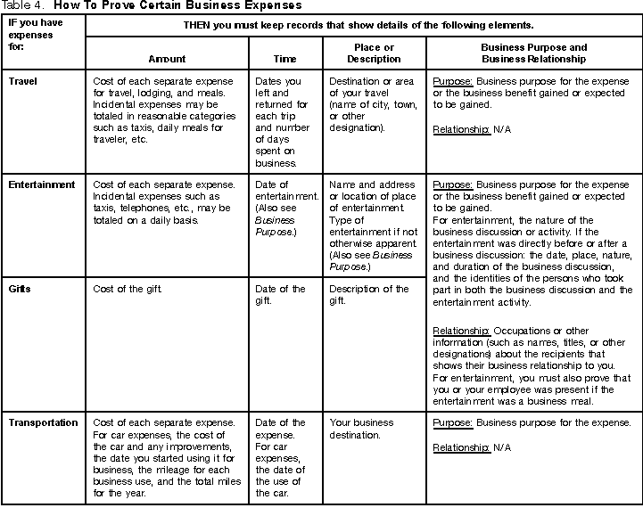 How To Prove ExpensesTable 4 is a summary of records you need to prove each expense discussed in this publication. You must be able to prove the elements listed across the top portion of the chart. You prove them by having the information and receipts (where needed) for the expenses listed in the first column.