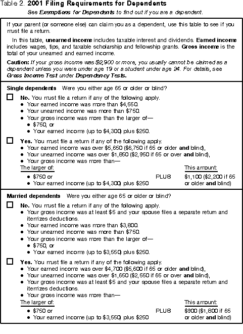 Residents of Puerto RicoGenerally, if you are a U.S. citizen and a resident of Puerto Rico, you must file a U.S. income tax return if you meet the income requirements. This is in addition to any legal requirement you may have to file an income tax return with Puerto Rico. If you are a resident of Puerto Rico for the whole year, your U.S. gross income does not include income from sources within Puerto Rico. However, include in your U.S. gross income any income you received for your services as an employee of the United States or any U.S. agency. If you receive income from Puerto Rican sources that is not subject to U.S. tax, you must reduce your standard deduction. This also reduces the amount of income you can have before you must file a U.S. income tax return. For more information, see Publication 570, Tax Guide for Individuals With Income From U.S. Possessions. Individuals With Income From U.S. PossessionsIf you had income from Guam, the Commonwealth of Northern Mariana Islands, American Samoa, or the Virgin Islands, special rules may apply when determining whether you must file a U.S. federal income tax return. In addition, you may have to file a return with the individual island government. See Publication 570 for more information. DependentsA person who is a dependent may still have to file a return. This depends on the amount of the dependent's earned income, unearned income, and gross income. For details, see Table 2. A dependent may also have to file if one of the situations described in Table 3 applies. Responsibility of parent. If a dependent child who must file an income tax return cannot file it for any reason, such as age, a parent, guardian, or other legally responsible person must file it for the child. If the child cannot sign the return, the parent or guardian must sign the child's name followed by the words "By (signature), parent (or guardian), for minor child." Earned income. This is salaries, wages, professional fees, and other amounts received as pay for work you actually perform. Earned income (only for purposes of filing requirements and the standard deduction) also includes any part of a scholarship that you must include in your gross income. See Publication 520, Scholarships and Fellowships, for more information on taxable and nontaxable scholarships. Child's earnings. Amounts a child earns by performing services are his or her gross income. This is true even if under local law the child's parents have the right to the earnings and may actually have received them. If the child does not pay the tax due on this income, the parent is liable for the tax. Unearned income. This is income such as interest, dividends, and capital gains. Trust distributions of interest, dividends, capital gains, and survivor annuities are considered unearned income also. Election to report child's unearned income on parent's return. You may be able to include your child's interest and dividend income on your tax return. If you choose to do this, your child will not have to file a return. However, all of the following conditions must be met.