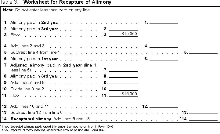 Table 3. Worksheet for Recapture of Alimony Filled-in Table 3. Worksheet for Recapture of Alimony Instruments Executed Before 1985The following rules for alimony apply to payments under divorce or separation instruments executed before 1985. Exception. There are two situations where the rules for instruments executed after 1984 apply to instruments executed before 1985.
