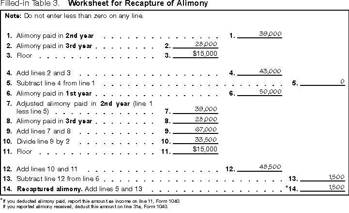 How to figure and report the recapture. Both you and your spouse can use Table 3 to figure recaptured alimony. Including the recapture in income. If you must include a recapture amount in income, show it on Form 1040, line 11 ("Alimony received"). Cross out "received" and write "recapture." On the dotted line next to the amount, enter your spouse's last name and social security number. Deducting the recapture. If you can deduct a recapture amount, show it on Form 1040, line 31a ("Alimony paid"). Cross out "paid" and write "recapture." In the space provided, enter your spouse's social security number. Example. You pay your former spouse $50,000 alimony the first year, $39,000 the second year, and $28,000 the third year. You complete Table 3 as shown on Filled-in Table 3. In the third year, you report $1,500 as income on line 11, Form 1040, and your former spouse reports $1,500 as a deduction on line 31a, Form 1040.