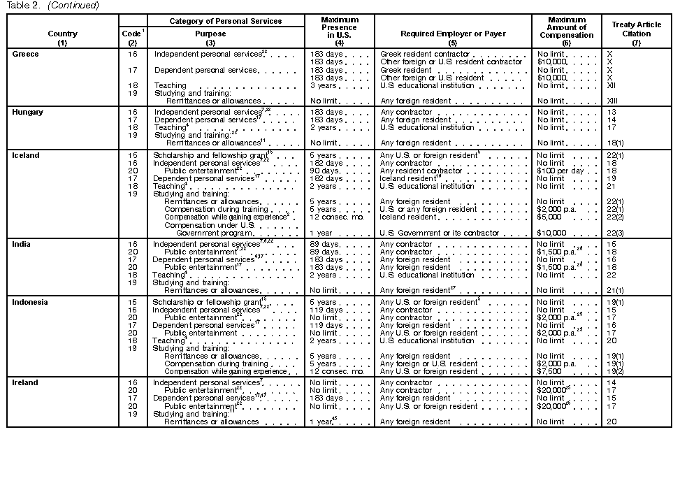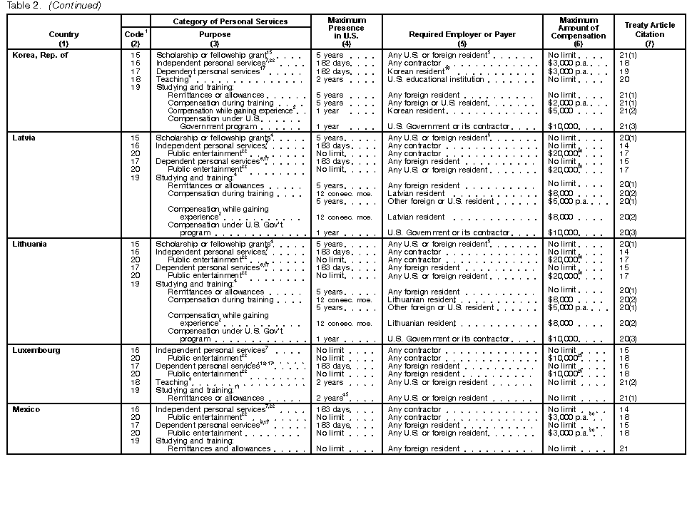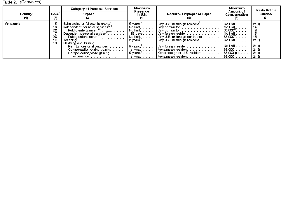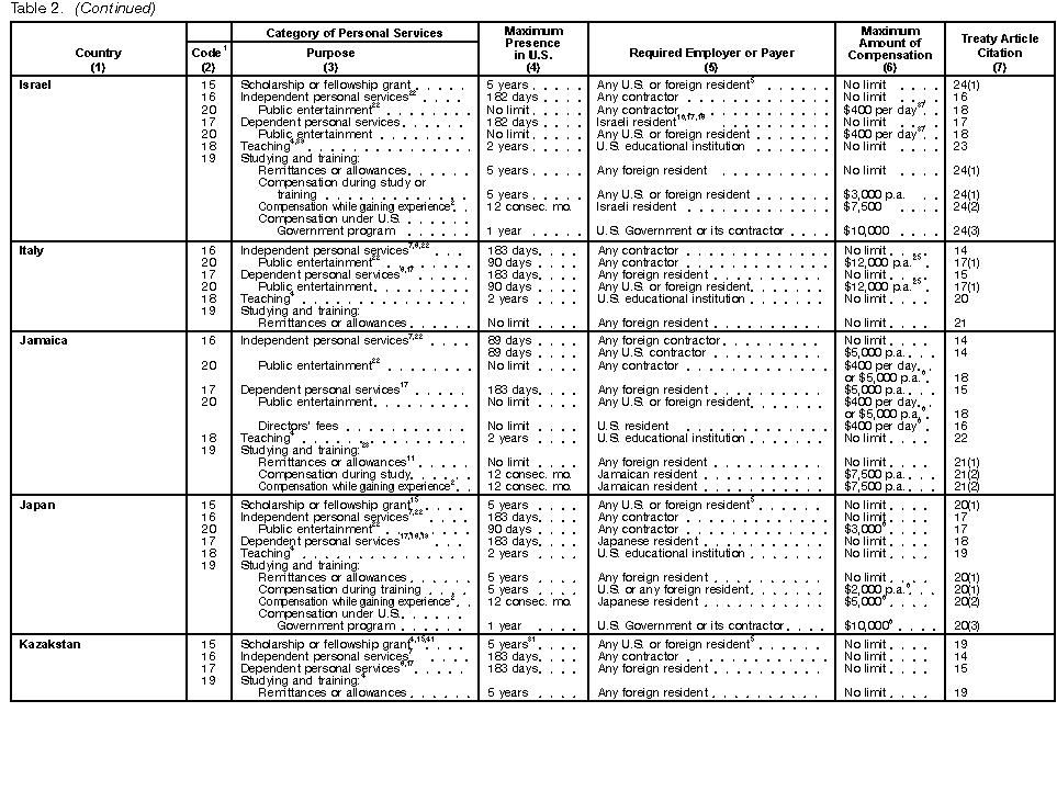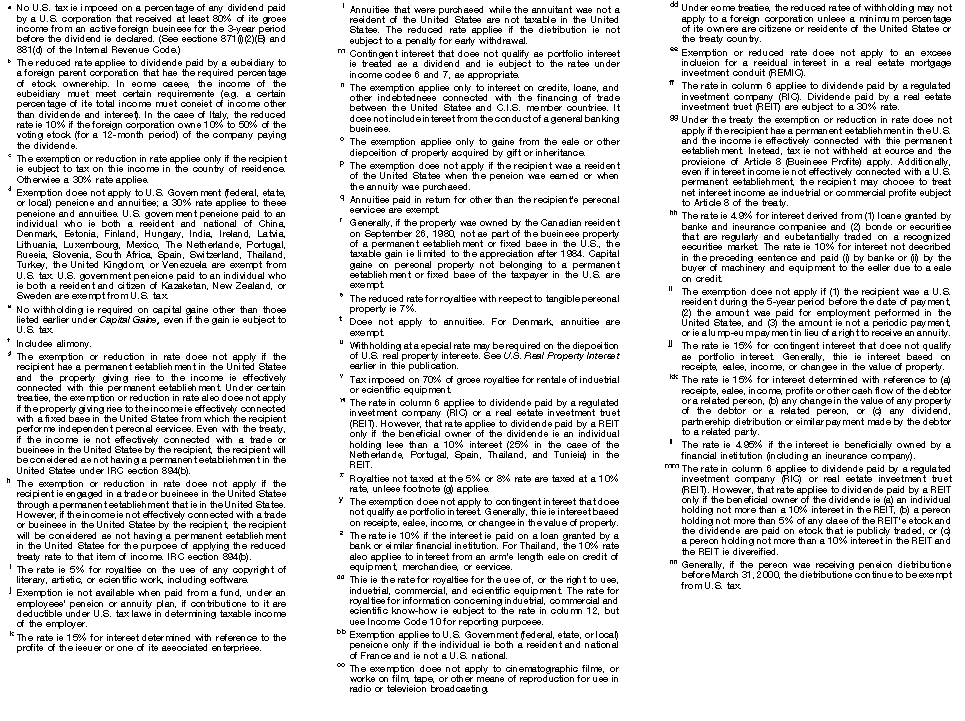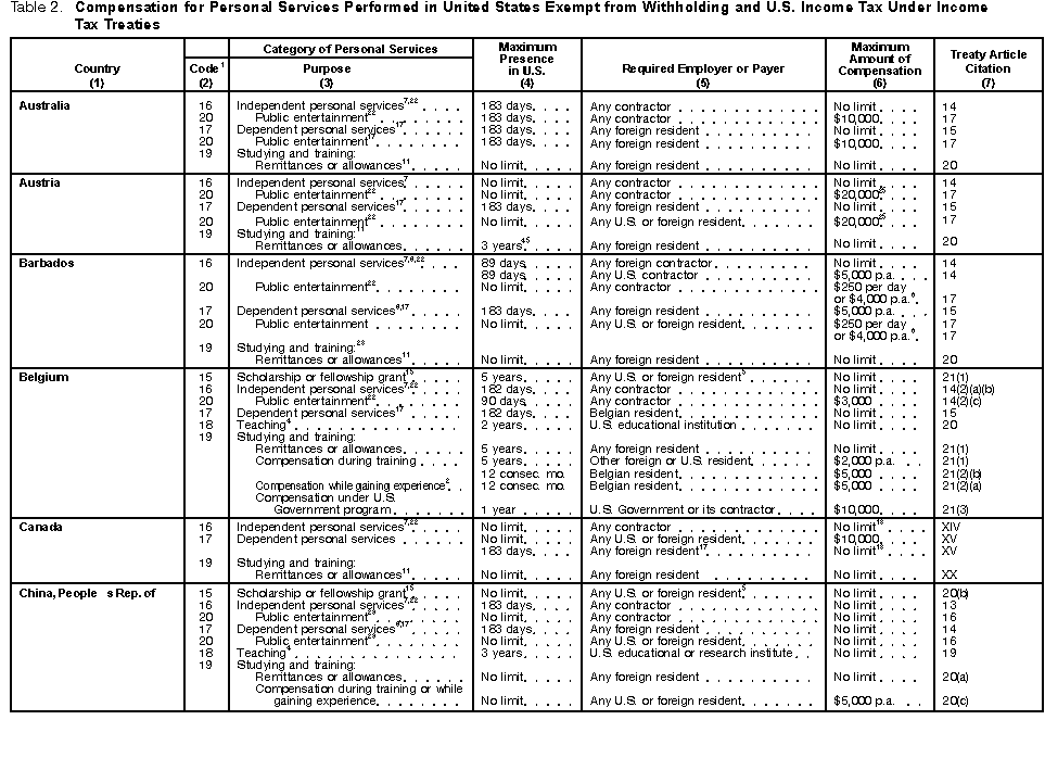 Tax Treaty TablesThe United States has income tax treaties (or conventions) with a number of foreign countries under which residents (sometimes limited to citizens) of those countries are taxed at a reduced rate or are exempt from U.S. income taxes on certain income received from within the United States. Three tables follow: Table 1 lists the withholding rates on income other than personal service income. Table 2 lists the different types of personal service income that are entitled to an exemption from, or reduction in, withholding. Table 3 shows where the full text of each treaty and protocol may be found in the Cumulative Bulletins if it has been published.