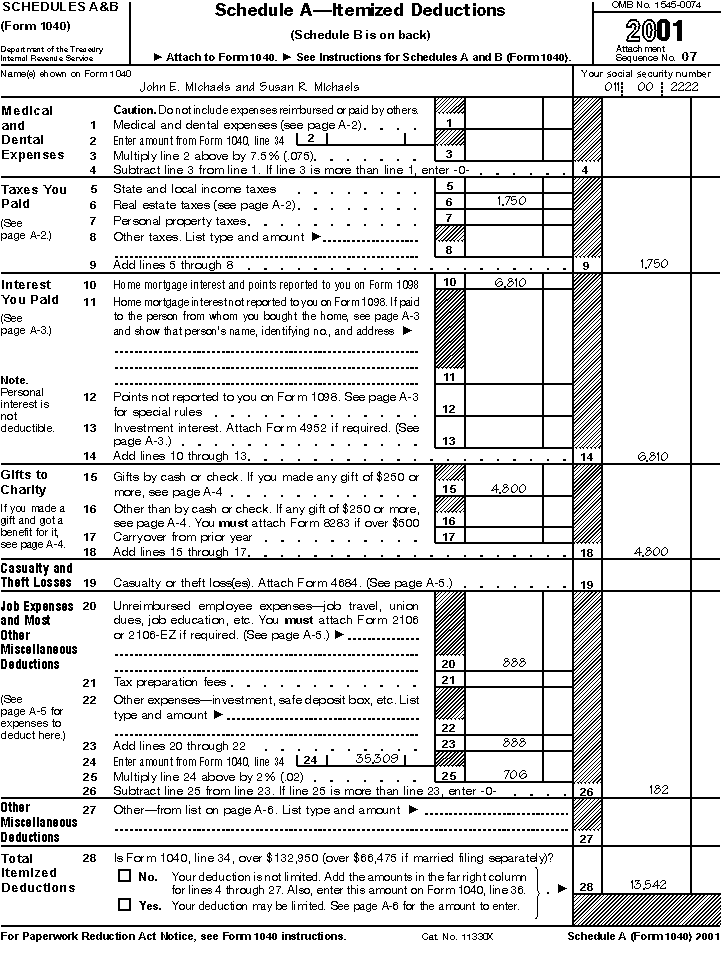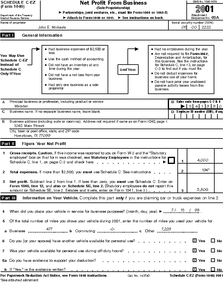 Comprehensive ExampleRev. John Michaels is the minister of the First United Church. He is married and has one child. The child is considered a qualifying child for the child tax credit. Mrs. Michaels is not employed outside the home. Rev. Michaels is a common-law employee of the church, and he has not applied for an exemption from SE tax. The church paid Rev. Michaels a salary of $31,000. In addition, as a self-employed person, he earned $4,000 during the year for weddings, baptisms, and honoraria. He made estimated tax payments during the year totaling $8,400. He taught a course at the local community college, for which he was paid $3,400. Rev. Michaels owns a home next to the church. He makes an $800 per month mortgage payment of principal and interest only. The church paid him $800 per month as his parsonage allowance (excluding utilities). The home's fair rental value is $900 per month. The utility bills for the year totaled $960. The church paid him $100 per month designated as an allowance for utility costs. The parts of Rev. and Mrs. Michaels' income tax return are explained in the order they are completed. They are illustrated in the order that the Rev. Michaels will assemble the return to send it to the IRS. Form W-2 From ChurchThe church completed its Form W-2 for Rev. Michaels as follows: Box 1. The church entered Rev. Michaels' $31,000 salary. Box 2. The church left this box blank because Rev. Michaels did not request federal income tax withholding. Boxes 3 through 6. Because Rev. Michaels is considered a self-employed person for purposes of social security and Medicare tax withholding, the church left these boxes blank. Box 14. The church entered Rev. Michaels' total parsonage and utilities allowance for the year and identified them. Form W-2 From CollegeThe community college gave Rev. Michaels a Form W-2 that showed the following: Box 1. The college entered Rev. Michaels' $3,400 salary. Box 2. The college withheld $272 in federal income tax on Rev. Michaels' behalf. Boxes 3 and 5. As an employee of the college, Rev. Michaels is subject to social security and Medicare withholding on his full salary from the college. Box 4. The college withheld $210.80 in social security taxes. Box 6. The college withheld $49.30 in Medicare taxes. Schedule C-EZ (Form 1040)Some of Rev. Michaels' entries on Schedule C-EZ are explained here. Line 1. Rev. Michaels reports the $4,000 from weddings, baptisms, and honoraria. Line 2. Rev. Michaels reports his expenses related to the line 1 amount. The total consisted of $87 for marriage and family booklets and $165 for 477 miles of business use of his car, mainly in connection with honoraria. Rev. Michaels used the standard mileage rate to figure his car expense. He multiplied the standard mileage rate of 34.5 cents by 477 miles to get $165. These expenses total $252 ($165 + $87). However, he cannot deduct the part of his expenses allocable to his tax-free parsonage allowance. He attaches the required statement, Attachment 1 (shown later) to his return showing that 23% (or $58) of his business expenses are not deductible because they are allocable to that allowance. He subtracts the $58 from the $252 and enters the $194 difference on line 2. Line 3. He enters his net profit of $3,806 both on line 3 and on Form 1040, line 12. Lines 4 through 8b. Rev. Michaels fills out these lines to report information about his car. Form 2106-EZRev. Michaels fills out Form 2106-EZ to report the unreimbursed business expenses he had as a common-law employee of First United Church. Line 1. Before completing line 1, Rev. Michaels fills out Part II because he used his car for church business. His records show that he drove 2,708 business miles, which he reports in Part II. On line 1, he multiplies 2,708 miles by the mileage rate of 34.5 cents for the year. The result is $934. Line 4. He enters $219 for his professional publications and booklets. Line 6. Before entering the total expenses on line 6, Rev. Michaels must reduce them by the amount allocable to his tax-free parsonage allowance. On the required Attachment 1 (shown later), he shows that 23% (or $265) of his employee business expenses are not deductible because they are allocable to the tax-free parsonage allowance. He subtracts $265 from $1,153 and enters the result, $888, on line 6. He also enters $888 on line 20 of Schedule A (Form 1040). Schedule A (Form 1040)Rev. Michaels fills out Schedule A as explained here. Line 6. Rev. Michaels deducts $1,750 in real estate taxes. Line 10. He deducts $6,810 of home mortgage interest. Line 15. Rev. and Mrs. Michaels contributed $4,800 in cash during the year to various qualifying charities. Each individual contribution was less than $250. Line 20. Rev. Michaels enters his unreimbursed employee business expenses from Form 2106-EZ, line 6. Lines 24, 25, and 26. He can deduct only the part of his employee business expenses that exceeds 2% of his adjusted gross income. He fills out these lines to figure the amount he can deduct. Line 28. The total of all the Michaels' itemized deductions is $13,542, which they enter on line 28 and on Form 1040, line 36. Schedule SE (Form 1040)After Rev. Michaels prepares Schedule C-EZ and Form 2106-EZ, he fills out Schedule SE. He reads the chart on page 1 of the schedule which tells him he can use Section A--Short Schedule SE to figure his self-employment tax. Rev. Michaels is a minister, so his salary from the church is not considered church employee income. Thus, he does not have to use Section B--Long Schedule SE. He fills out the following lines in Section A. Line 2. Rev. Michaels attaches a statement (see Attachment 2, later) that explains how he figures the amount ($44,395) to enter. Line 4. He multiplies $44,395 by .9235 to get his net earnings from self-employment ($40,999). Line 5. Because the amount on line 4 is less than $80,400, Rev. Michaels multiplies the amount on line 4 ($40,999) by .153 to get his self-employment tax of $6,