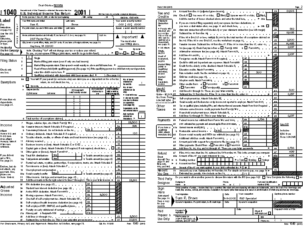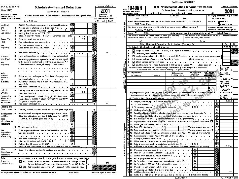 Illustration of Dual-Status ReturnSam R. Brown is single and a subject of the United Kingdom (U.K.). He temporarily entered the United States with an H-1 visa to develop a new product line for the Major Product Co. He arrived in the United States March 18, 2001, and left May 25, 2001, returning to his home in England. The Major Product Co. later offered Sam a permanent job, and he returned to the United States with a permanent visa on September 10, 2001. During Sam's temporary assignment in the United States, the Major Product Co. paid him $6,500. He accounted to his employer for his expenses for travel, meals, and lodging while on temporary assignment, and was reimbursed for his expenses. This amount was not included on his wage statement, Form W-2, given to him when he left the United States. After Sam became permanently employed, his wages for the rest of the year were $21,800, including reimbursement of his moving expenses. He received a separate Form W-2 for this period. His other income received in 2001 was: Interest income paid by the U.S. Bank (not effectively connected):
