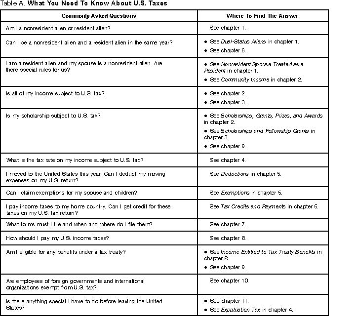 Table A. What You Need To Know About Taxes For tax purposes, an alien is an individual who is not a U.S. citizen. Aliens are classified as nonresident aliens and resident aliens. This publication will help you determine your status and give you information you will need to file your U.S. tax return. Resident aliens generally are taxed on their worldwide income, the same as U.S. citizens. Nonresident aliens are taxed only on their income from sources within the United States and on certain income connected with the conduct of a trade or business in the United States. Table A, What You Need To Know About U.S. Taxes, provides a list of questions and the chapter or chapters in this publication where you will find the related discussion. Answers to frequently asked questions are presented in the back of the publication. The information in this publication is not as comprehensive for resident aliens as it is for nonresident aliens. Resident aliens are generally treated the same as U.S. citizens and can find more information in other IRS publications. Comments and suggestions. We welcome your comments about this publication and your suggestions for future editions. You can e-mail us while visiting our web site at www.irs.gov. You can write to us at the following address: