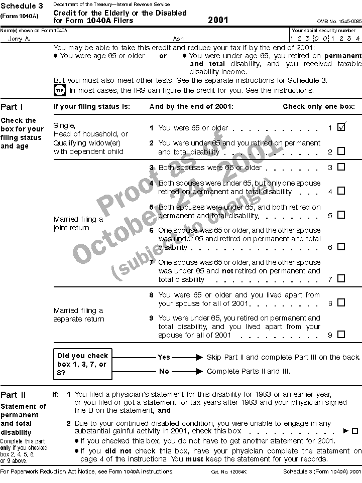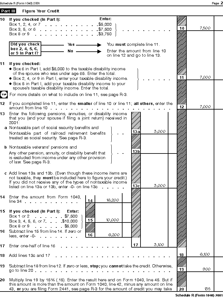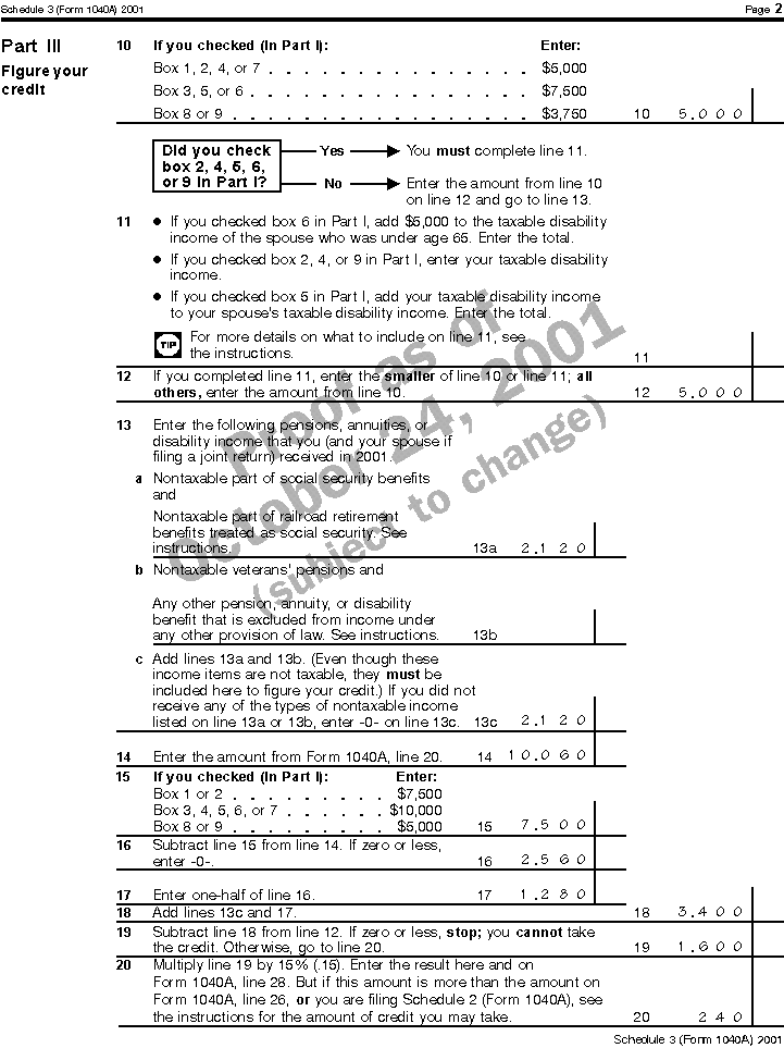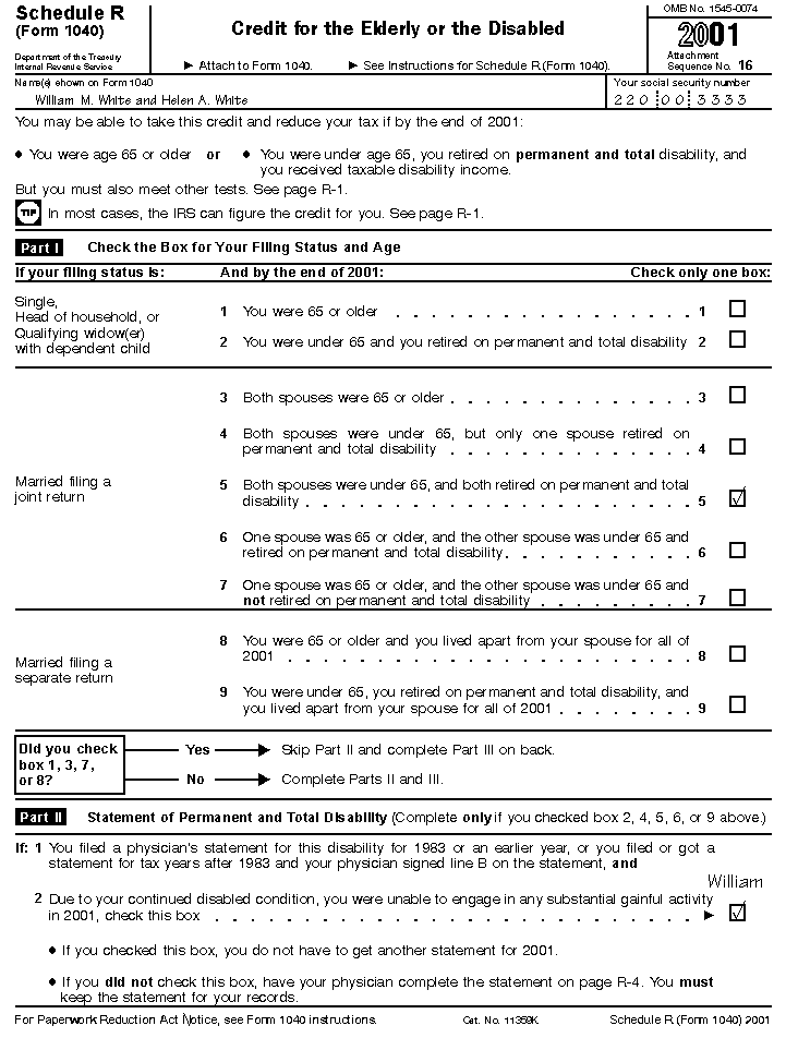 Credit Figured for YouIf you choose to have the Internal Revenue Service (IRS) figure the credit for you, read the following discussion for the form you will file (Form 1040 or Form 1040A). If you want the IRS to figure your tax, see Publication 967. Form 1040. If you want the IRS to figure your credit, attach Schedule R to your return and enter "CFE" on the dotted line next to line 45 of Form 1040. Check the box in Part I of Schedule R for your filing status and age. Fill in Part II and lines 11 and 13 of Part III if they apply to you. Form 1040A. If you want the IRS to figure your credit, attach Schedule 3 to your return and print "CFE" next to line 28 of Form 1040A. Check the box in Part I of Schedule 3 for your filing status and age. Fill in Part II and lines 11 and 13 of Part III, if they apply to you. ExamplesThe following examples illustrate the credit for the elderly or the disabled. The initial amounts are taken from Table 1. Example 1. James Davis is 58 years old and single, and files Form 1040A. In 1998 he retired on permanent and total disability, and he is still permanently and totally disabled. He got the required physician's statement in 1998 and kept it with his tax records. His physician signed on line B of the statement. This year James checks the box in Part II of Schedule 3. He does not need to get another statement for 2001. He received the following income for the year: