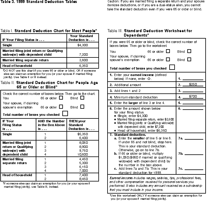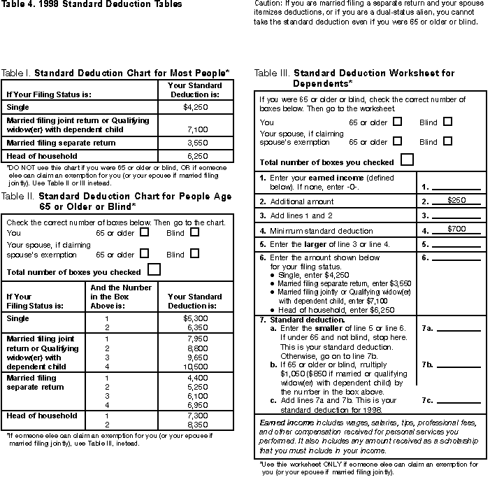 Standard deduction for earlier years. To determine if amounts recovered in 2001 must be included in your income, you must know the standard deduction for your filing status for the year the deduction was claimed. The standard deduction tables for 2000, 1999, and 1998 are shown in Tables 2, 3, and 4. If you need the standard deduction amounts for years before 1998, see the copy of your return for that year. Example. You filed a joint return for 2000 with a taxable income of $25,000. Your itemized deductions were $8,700. The standard deduction that you could have claimed was $7,350. In 2001, you recovered $2,400 of your 2000 itemized deductions. None of the recoveries were more than the actual deductions for 2000. Include $1,350 of the recoveries in your 2001 income. This is the smaller of your recoveries ($2,400) or the amount by which your itemized deductions were more than the standard deduction ($8,700 - $7,350 = $1,350). Negative taxable income. If your taxable income was a negative amount, reduce the recovery you must otherwise include in your income by the negative amount. Example. The facts are the same as in the previous example except you had a negative taxable income of $200 in 2000. You must include $1,150 in your 2001 income, rather than $1,350. Recovery limited to deduction. You do not include in your income any amount of your recovery that is more than the amount you deducted in the earlier year. The amount you include in your income is limited to the smaller of: