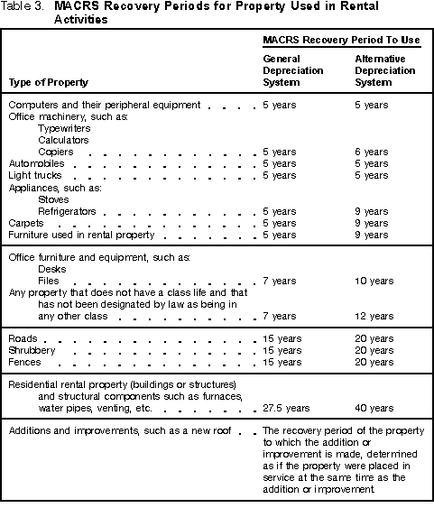MACRS Depreciation Under ADSIf you choose, you can use the ADS method for most property. Under ADS, you use the straight line method of depreciation. Table 3 shows the recovery periods for property used in rental activities that you depreciate under ADS. See Appendix B in Publication 946 for other property. If your property is not listed, it is considered to have no class life. Under ADS, personal property with no class life is depreciated using a recovery period of 12 years. Use the mid-month convention for residential rental property. For all other property, use the half-year or mid-quarter convention. Election. You choose to use ADS by entering the depreciation on line 16, Part II of Form 4562. The election of ADS for one item in a class of property generally applies to all property in that class that is placed in service during the tax year of the election. However, the election applies on a property-by-property basis for residential rental property. Once you choose to use ADS, you cannot change your election. |