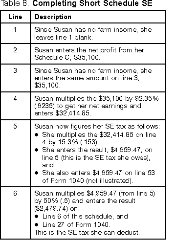 Filled-In Form ExamplesThe following examples illustrate the use of the short and long forms of Schedule SE (Form 1040). Short Schedule SE ExampleThe following example shows how Susan J. Brown fills out Section A-Short Schedule SE. BackgroundSusan J. Brown is the sole proprietor of a dress shop, "Milady Fashions." She received no wages and she does not own any other business. Her husband has no interest in her business. Her Schedule C (Form 1040) shows a net profit of $35,100 in 2001. Completing Schedule SESusan's completed Schedule SE with Short Schedule SE filled out is shown later. The following table describes how Susan completes each line on her schedule.
