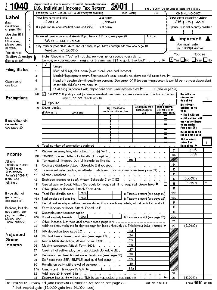 Line 24. The adjustment on line 24 is your capital loss deduction (line 22) that is more than your net capital loss, without regard to any section 1202 exclusion (line 21). Line 25. The adjustment on line 25 is your nondeductible capital losses (line 18) that are more than the nondeductible net capital loss (line 23) on your return, without regard to any section 1202 exclusion claimed on Schedule D. (You had a nondeductible net capital loss if your net capital loss was more than your capital loss deduction. Adjustment for NOL deduction (line 26). You cannot deduct any NOL carryovers or carrybacks from other years. Your adjustment is the total amount of your NOL deduction for losses from other years. Illustrated Schedule A (Form 1045)The following example illustrates how to figure an NOL. It includes filled-in pages 1 and 2 of Form 1040 and Schedule A (Form 1045). Example. Glenn Johnson is in the retail record business. He is single and has the following income and deductions on his Form 1040 for 2001.