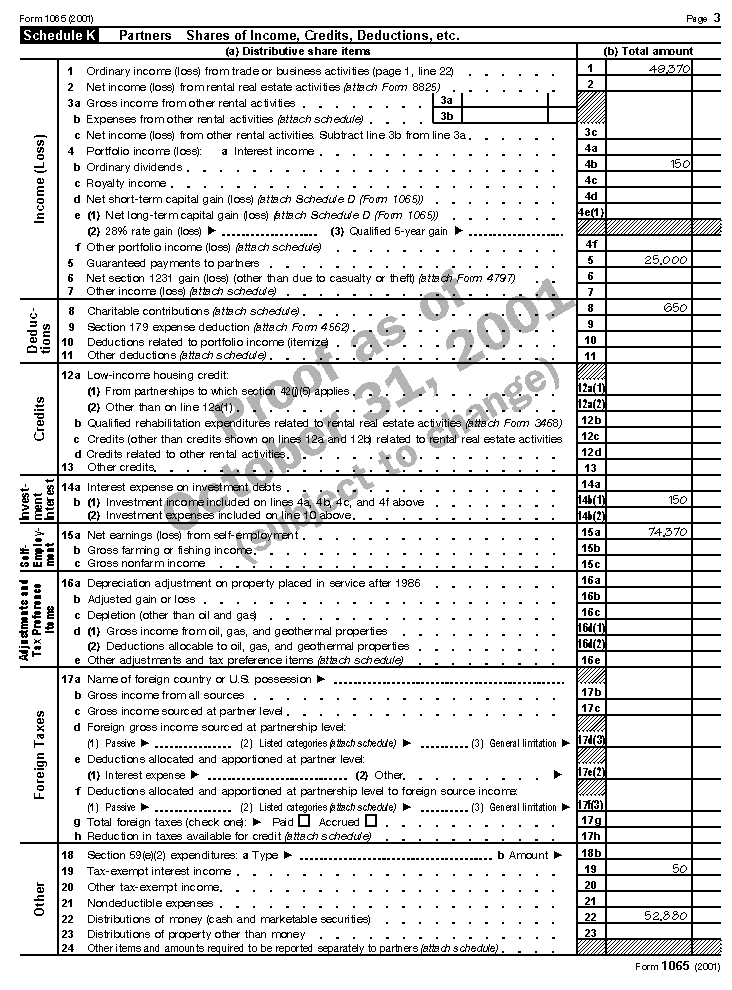 Form 1065 ExampleThis filled-in Form 1065 is for the AbleBaker Book Store, a partnership composed of Frank Able and Susan Baker. The partnership uses an accrual method of accounting and a calendar year for reporting income and loss. Frank works full time in the business, while Susan works approximately 25% of her time in it. Both partners are general partners. The partnership agreement states that Frank will receive a yearly guaranteed payment of $20,000 and Susan will receive $5,000. Any profit or loss will be shared equally by the partners. The partners are personally liable for all partnership liabilities. Both partners materially participate in the operation of the business. In addition to receiving income and paying expenses in its partnership operations, AbleBaker made a $650 cash charitable contribution, received $150 from dividends, and received $50 tax-exempt interest from municipal bonds. Frank completes the partnership's Form 1065 as explained next. Page 1The IRS sent Frank a postcard with the partnership's preaddressed label, asking if he needed a Form 1065 package. He returned the postcard and the IRS sent him the package. When Frank completes the return, he places the partnership's label in the address area on page 1. Frank supplies all the information requested at the top of the page. IncomeThe partnership's ordinary income from the trade or business activity is shown on lines 1a through 8. Line 1. Gross sales of $409,465 are entered on line 1a. Returns and allowances of $3,365 are entered on line 1b, resulting in net sales of $406,100, entered on line 1c. Line 2. Cost of goods sold, $267,641, from Schedule A, line 8, is entered here. Line 3. Gross profit of $138,459 is shown on this line. Line 7. Interest income on accounts receivable, $559, is entered on this line. The schedule that must be attached for this line is not shown. Line 8. Total income, $139,018 (lines 3 through 7), is shown here. DeductionsThe partnership's allowable deductions are shown on lines 9 through 21. Line 9. All salaries and wages are included here except guaranteed payments to partners (shown on line 10). Frank enters the $29,350 wages paid to the partnership's employees. The partnership had no employment credits to reduce that amount. Line 10. Guaranteed payments of $25,000 to partners Frank ($20,000) and Susan ($5,000) are entered here. Line 11. Repairs of $1,125 made to partnership equipment are entered on this line. Line 12. During the year, $250 owed to the partnership was determined to be a wholly worthless business bad debt. The $250 is shown on this line. (If this had been a nonbusiness bad debt, it would have been reported in Part I of Schedule D (Form 1065) and included separately on Schedules K and K-1, line 7, as a stated short-term capital loss.) Line 13. Rent paid for the business premises, $20,000, is listed on this line. Line 14. Deductible taxes of $3,295 are entered on this line. Line 15. Interest paid to suppliers during the year totaled $1,451. This is business interest, so it is entered here. Lines 16a and 16c. Depreciation of $1,174 claimed on assets used in the partnership's business is entered on these lines. (Line 16b is left blank because there is no depreciation listed elsewhere on the return.) Frank does not need to attach Form 4562 because the partnership did not place property in service during 2001 or depreciate or claim a deduction for a car or other listed property. Line 20. Other allowable deductions of $8,003 not listed elsewhere on the return and for which a separate line is not provided on page 1 are included on this line. Frank attaches a schedule that lists each deduction and the amount included on line 20. This schedule is not shown. Line 21. The total of all deductions, $89,648 (lines 9 through 20), is entered on this line. Ordinary Income (Loss)Line 22. The amount on line 21 is subtracted from the amount on line 8. The result, $49,370, is entered here and on line 1 of Schedule K. The amount allocated to each partner is listed on line 1 of Schedule K-1. SignaturesFrank signs the return as a general partner. The AbleBaker Book Store did not have a paid preparer. Page 2 Schedule ASchedule A shows the computation of cost of goods sold. Beginning inventory, $18,125, is entered on line 1 and net purchases, $268,741, are entered on line 2. The total, $286,866, is entered on line 6. Ending inventory, $19,225 (entered on line 7), is subtracted from line 6 to arrive at cost of goods sold, $267,641 (entered on line 8 and on page 1, line 2). Frank answers all applicable questions for item 9. Schedule BSchedule B contains 12 questions about the partnership. Frank answers question 1 by marking the "Domestic general partnership" box. He answers questions 2 through 11 by marking the "No" boxes. He answers question 12 by entering -0- on this line. Question 5 asks if the partnership meets all the requirements listed in items 5a, b, and c. Because the partnership's total receipts were not less than $250,000, all three of these requirements are not met. Frank must complete Schedules L, M-1, M-2, and item F on page 1 of Form 1065 and item J on Schedule K-1. Pages 3 - 4 Schedule KOn Schedule K, Frank lists the total of both partners' shares of income, deductions, credits, etc. Each partner's distributive share of income, deductions, credits, etc., is reported on Schedule K-1. The line items for Schedule K are discussed in combination with the Schedule K-1 line items, later. Analysis of Net Income (Loss)An analysis must be made of the distributive items on Schedule K. This analysis is based on the type of partner. Since the AbleBaker Book Store has two individual partners, both of whom are "active" general partners, the total on line 1, $73,870, is entered on line 2a, column ii. Page 4 Schedules L, M-1, and M-2Partnerships do not have to complete Schedules L, M-1, or M-2 if all the tests listed under question 5 of Schedule B are met and question 5 is marked "Yes." The AbleBaker 