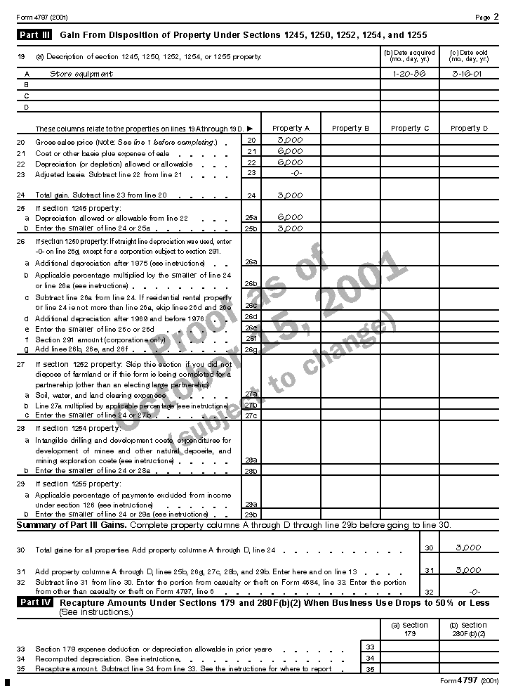 ExampleJane Smith is single. At the beginning of 2001, she owned and operated Jane's Dress Shop at 25 Main Street, Smalltown, Virginia. On March 16, she traded the land and building where she operated her dress shop for other land and a building around the corner at 97 Oak Street. She then opened the J. Smith Hardware Store. Jane also sold all the equipment she had used in her dress shop, as well as a vacant lot across the street from the shop used for customer parking. She reports these transactions as shown in the filled-in Form 4797 and Form 8824 at the end of this chapter. Form 4797Jane sold the equipment she used in her dress shop for $3,000. She originally paid $6,000 for it on January 20, 1986, and had fully depreciated it. She realized a gain of $3,000. Because the gain was less than the $6,000 depreciation taken, all her gain is ordinary income from depreciation. This amount is reported in Part III of Form 4797 and entered in Part II on line 13. The adjusted basis of the vacant lot (acquired in 1980) was $6,000 and its sales price was $8,000. Jane reports her $2,000 gain from the sale in Part I of Form 4797. Jane had a nonrecaptured net section 1231 loss of $1,200. She shows this loss in Part I on line 8. Since the net section 1231 gain of $2,000 is more than the nonrecaptured loss, that gain is treated as ordinary gain only up to the loss. Therefore, the loss of $1,200 on line 8 is entered as an ordinary gain in Part II of Form 4797 on line 12. The loss is also subtracted from the $2,000 gain on line 7. The $800 balance is entered on line 9. Form 8824Because Jane entered into a like-kind exchange by trading her business real property for other business real property, she must report the transaction on Form 8824 and attach the form to her tax return. On lines 16 and 17 of Form 8824, Jane enters the fair market value of her new property, $120,000, consisting of $95,000 for the building and $25,000 for the land. On line 18 she enters the adjusted basis of the old property, $100,000, consisting of $36,919 for the building and $63,081 for the land. Her realized gain on line 19 is $20,000. Under the like-kind exchange rules, this gain is not recognized. Jane enters "-0-" on line 20. However, because there is additional depreciation of $9,274 on the old building, Jane must determine whether any of her gain has to be recognized as ordinary income under the recapture rules. The old building has an FMV of $90,000. Had the transaction been a cash sale, Jane's realized gain on the building would have been $53,081 ($90,000 - $36,919). The additional depreciation is less than that amount, so her ordinary income due to the additional depreciation would have been $9,274. That amount is less than the $95,000 fair market value of the new building, and there is no ordinary income recognized on the exchange. The $9,274 ordinary income that does not have to be reported is carried over to the new building as additional depreciation. Jane enters "-0-" on line 21 of Form 8824 and line 16 of Form 4797. All of Jane's $20,000 gain is deferred (line 24). The basis of her new property (line 25) is $100,000, the same as the adjusted basis of her old property. Of that amount, $79,167 [($95,000 ÷ $120,000) × $100,000] is allocated to the building and $20,833 [($25,000 ÷ $120,000) × $100,000] is allocated to the land. SummaryThe entries in Part II, Form 4797, show an ordinary gain of $4,200, which is carried to line 14, Form 1040. The entries in Part I, Form 4797, result in a long-term capital gain of $800 from section 1231 transactions. This is carried to line 11, Schedule D (Form 1040), column (f). |