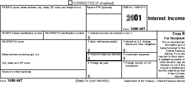 Interest excluded under the Education Savings Bond Program. Use Form 8815, to figure your interest exclusion when you redeem qualified savings bonds and pay qualified higher educational expenses during the same year. For more information on the exclusion and qualified higher educational expenses, see the earlier discussion under Education Savings Bond Program. You must show your total interest from qualified savings bonds that you cashed during 2001 on line 6 of Form 8815 and on line 1 of either Schedule 1 (Form 1040A) or Schedule B (Form 1040). After completing Form 8815, enter the result from line 14 (Form 8815) on line 3 of Schedule 1 (Form 1040A) or line 3 of Schedule B (Form 1040). Interest on seller-financed mortgage. If an individual buys his or her home from you in a sale that you finance, you must report the buyer's name, address, and social security number on line 1 of Schedule 1 (Form 1040A) or line 1 of Schedule B (Form 1040). If you do not, you may have to pay a $50 penalty. The buyer may have to pay a $50 penalty if he or she does not give you this information. You must also give your name, address, and social security number (or employer identification number) to the buyer. If you do not, you may have to pay a $50 penalty. Frozen deposits. Even if you receive a Form 1099-INT for interest on deposits that you could not withdraw at the end of 2001, you must exclude these amounts from your gross income. (See Interest income on frozen deposits under Interest Income, earlier.) Do not include this income on line 8a of Form 1040A or Form 1040. In Part I of Schedule 1 (Form 1040A) or Part I of Schedule B (Form 1040), include the full amount of interest shown on your Form 1099-INT on line 1. Several lines above line 2, put a subtotal of all interest income. Below this subtotal, write "Frozen Deposits" and show the amount of interest that you are excluding. Subtract this amount from the subtotal and write the result on line 2. Accrued interest on bonds. If you received a Form 1099-INT that reflects accrued interest paid on a bond you bought between interest payment dates, include the full amount shown as interest on the Form 1099-INT on line 1, Part I of Schedule B (Form 1040). Then, below a subtotal of all interest income listed, print "Accrued Interest" and the amount of accrued interest that you paid to the seller. That amount is taxable to the seller, not you. Subtract that amount from the interest income subtotal. Enter the result on line 2 and also on Form 1040, line 8a. For more information, see Bonds Sold Between Interest Dates, earlier. Nominee distributions. If you received a Form 1099-INT that includes an amount you received as a nominee for the real owner, report the full amount shown as interest on the Form 1099-INT on line 1, Part I of Schedule 1 (Form 1040A) or Schedule B (Form 1040). Then, below a subtotal of all interest income listed, write "Nominee Distribution" and the amount that actually belongs to someone else. Subtract that amount from the interest income subtotal. Enter the result on line 2 and also on line 8a of Form 1040A or 1040. File Form 1099-INT with the IRS. If you received interest as a nominee in 2001, you must file a Form 1099-INT for that interest with the IRS. Send Copy A of Form 1099-INT with a Form 1096, Annual Summary and Transmittal of U.S. Information Returns, to your Internal Revenue Service Center by February 28, 2002 (April 1, 2002 if you file Form 1099-INT electronically). Give the actual owner of the interest Copy B of the Form 1099-INT by January 31, 2002. On Form 1099-INT, you should be listed as the "Payer." Prepare one Form 1099-INT for each other owner and show that person as the "Recipient." However, you do not have to file Form 1099-INT to show payments for your spouse. For more information about the reporting requirements and the penalties for failure to file (or furnish) certain information returns, see the General Instructions for Forms 1099, 1098, 5498, and W2-G. Similar rules apply to OID reported to you as a nominee on Form 1099-OID. You must file a Form 1099-OID with Form 1096 to show the proper distributions of the OID. Example. You and your sister have a joint savings account that paid $1,500 interest for 2001. Your sister deposited 30% of the funds in this account, and you and she have agreed to share the yearly interest income in proportion to the amount that each of you has invested. Because your social security number was given to the bank, you received a Form 1099-INT for 2001 that includes the interest income belonging to your sister. This amount is $450, or 30% of the total interest of $1,500. You must give your sister a Form 1099-INT by January 31, 2002, showing $450 of interest income that she earned for 2001. You must also send a copy of the nominee Form 1099-INT, along with Form 1096, to the Internal Revenue Service Center by February 28, 2002 (April1, 2002, if you file form 1099-INT electronically). Show your own name, address, and social security number as that of the "Payer" on the Form 1099-INT. Show your sister's name, address, and social security number in the blocks provided for identification of the "Recipient." When you prepare your own federal income tax return, report the total amount of interest income, $1,500, on line 1, Part I of Schedule 1 (Form 1040A) or line 1, Part I of Schedule B (Form 1040), and identify the name of the bank that paid this interest. Show the amount belonging to your sister, $450, as a subtraction from a subtotal of all interest on Schedule 1 (or Schedule B) and identify this subtraction as a "Nominee Distribution." (Your sister will report the $450 of interest income on her own tax return, if she has to file a return, and identify you as the payer of that amount.) Original issue discount (OID) adjustment. If you are reporting OID in an amount greater or less than the amount shown on Form 1099-OID or other written statement (such as for a REMIC regular interest), include the