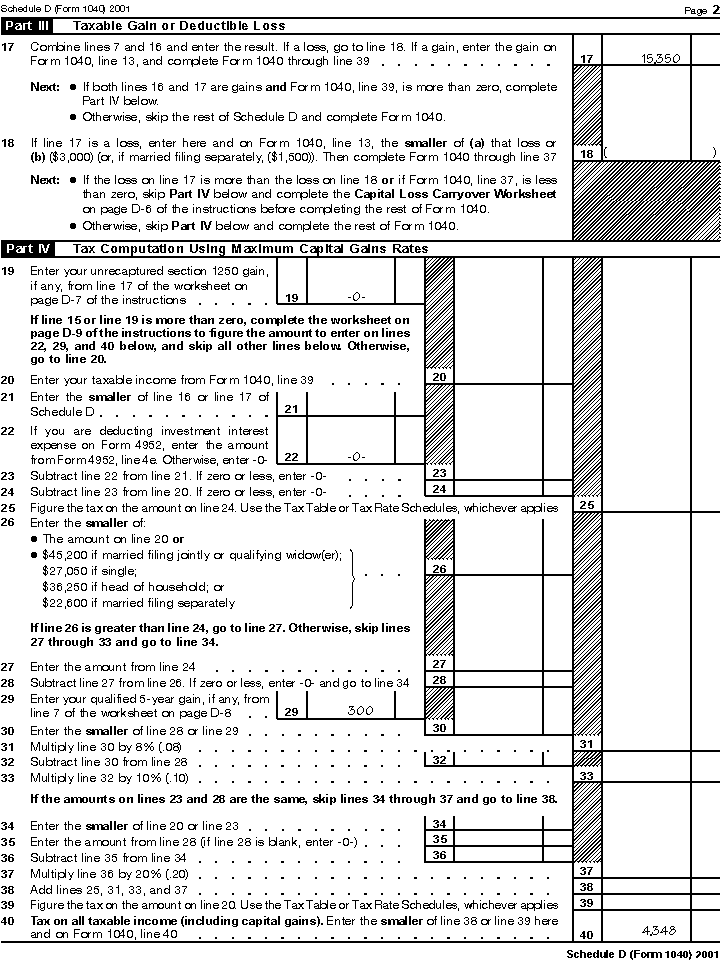 Comprehensive ExampleEmily Jones is single and, in addition to wages from her job, she has income from stocks and other securities. For the 2001 tax year, she had the following capital gains and losses, which she reports on Schedule D. Her filled-in Schedule D is shown at the end of this example. Capital gains and losses--Schedule D. Emily sold stock in two different companies that she held for less than a year. In June, she sold 100 shares of Trucking Co. stock that she had bought in February. She had an adjusted basis of $1,150 in the stock and sold it for $400, for a loss of $750. In July, she sold 25 shares of Computer Co. stock that she bought in June. She had an adjusted basis in the stock of $2,000 and sold it for $2,500, for a gain of $500. She reports these short-term transactions on line 1 in Part I of Schedule D. Emily had three other stock sales that she reports as long-term transactions on line 8 in Part II of Schedule D. In February, she sold 60 shares of Car Co. for $2,100. She had inherited the Car stock from her father. Its fair market value at the time of his death was $2,500, which became her basis. Her loss on the sale is $400. Because she had inherited the stock, her loss is a long-term loss, regardless of how long she and her father actually held the stock. She enters the loss in column (f) of line 8. In June, she sold 500 shares of Furniture Co. stock for $5,000. She had bought 100 of those shares in 1990, for $1,000. She had bought 100 more shares in 1992 for $2,200, and an additional 300 shares in 1995 for $1,500. Her total basis in the stock is $4,700. She has a $300 ($5,000 - $4,700) gain on this sale, which she enters in column (f) of line 8. Because she held all 500 shares for more than 5 years, the entire gain is qualified 5-year gain. In December, she sold 20 shares of Toy Co. stock for $4,100. This was qualified small business stock that she had bought in September 1997. Her basis is $1,100, so she has a $3,000 gain, which she enters in column (f) of line 8. Because she held the stock more than 5 years, she has a $1,500 section 1202 exclusion. She enters that amount in column (g) as a 28% rate gain and claims the exclusion on the line below by entering $1,500 as a loss in column (f). She received a Form 1099-B (not shown) from her broker for each of these transactions. The entries shown in box 2 total $14,100. Reconciliation of Forms 1099-B. Emily makes sure that the total of the amounts reported in column (d) of lines 3 and 10 of Schedule D is not less than the total of the amounts shown on the Forms 1099-B she received from her broker. For 2001, the total of lines 3 and 10 of Schedule D is $14,100, which is the same amount reported by the broker on Forms 1099-B. Form 6781. During 2001, Emily had a realized loss from a regulated futures contract of $11,000. She also had an unrealized marked to market gain on open contracts of $27,000 at the end of 2001. She had reported an unrealized marked to market gain of $1,000 on her 2000 tax return. (This $1,000 must be subtracted from her 2001 profit.) These amounts are shown in boxes 6, 7, and 8 of the Form 1099-B she received from her broker. Box 9 shows her combined profit of $15,000 ($27,000 - $1,000 - $11,000). She reports this gain in Part I of Form 6781 (not shown). She shows 40% as short-term gain on line 4 of Schedule D and 60% as long-term gain on line 11 of Schedule D. The Form 1099-B that Emily received from her broker, XYZ Trading Co., is shown later. Capital loss carryover from 2000. Emily has a capital loss carryover to 2001 of $800, of which $300 is short-term capital loss, and $500 is long-term capital loss. She enters these amounts on lines 6 and 14 of Schedule D. She kept the completed Capital Loss Carryover Worksheet in her 2000 Schedule D instructions (not shown), so she could properly report her loss carryover for the 2001 tax year without refiguring it. Tax computation. Because Emily has gains on both lines 16 and 17 of Schedule D and has taxable income, she goes to Part IV of Schedule D to figure her tax. But because line 15 of schedule D is more than zero (due to her section 1202 gain from selling qualified small business stock), she must also use the Schedule D Tax Worksheet to figure her tax. She must also complete the Qualified 5-Year Gain Worksheet (not shown) in her Schedule D instructions. After entering the gain from line 17 on line 13 of her Form 1040, she completes the rest of Form 1040 through line 39. She enters the amount from that line, $30,000, on line 1 of the Schedule D Tax Worksheet. After filling out the rest of that worksheet, she figures her tax is $4,348. This is less than the tax she would have figured without the capital gain tax rates, $4,876.