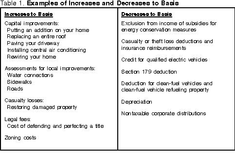 Table 1. Examples of Increases and Decreases to Basis Decreases to BasisThe following items reduce the basis of property.