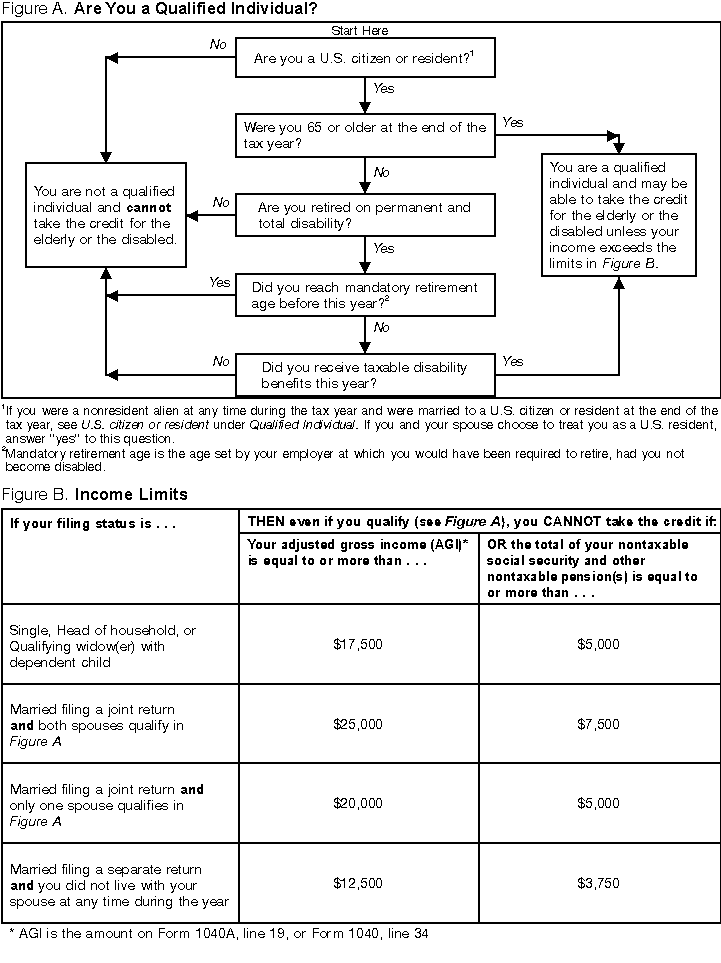 U.S. citizen or resident. You must be a U.S. citizen or resident (or be treated as a resident) to take the credit. Generally, you cannot take the credit if you were a nonresident alien at any time during the tax year. Exceptions. You may be able to take the credit if you are a nonresident alien who is married to a U.S. citizen or resident at the end of the tax year and you and your spouse choose to treat you as a U.S. resident. If you make that choice, both you and your spouse are taxed on your worldwide income. If you were a nonresident alien at the beginning of the year and a resident at the end of the year, and you were married to a U.S. citizen or resident at the end of the year, you may be able to choose to be treated as a U.S. resident for the entire year. In that case, you may be allowed to take the credit. For information on these choices, see chapter 1 of Publication 519, U.S. Tax Guide for Aliens. Married persons. Generally, if you are married at the end of the tax year, you and your spouse must file a joint return to take the credit. However, if you and your spouse did not live in the same household at any time during the tax year, you can file either a joint return or separate returns and still take the credit. Head of household. You can file as head of household and qualify to take the credit even if your spouse lived with you during the first 6 months of the year if you meet all of the tests. See Publication 524 and Publication 501. Under age 65. If you are under age 65, you can qualify for the credit only if you are retired on permanent and total disability. You are retired on permanent and total disability if: