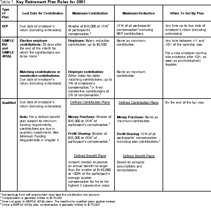 Table 1. Key Retirement Plan Rules SEP, SIMPLE, and qualified plans offer you and your employees a tax-favored way to save for retirement. You can deduct contributions you make to the plan for your employees. If you are a sole proprietor, you can deduct contributions you make to the plan for yourself. You can also deduct trustees' fees if contributions to the plan do not cover them. Earnings on the contributions are generally tax free until you or your employees receive distributions from the plan. Under certain plans, employees can have you contribute limited amounts of their before-tax pay to a plan. These amounts (and earnings on them) are generally tax free until your employees receive distributions from the plan. What this publication covers. This publication contains the information you need to understand the following topics.