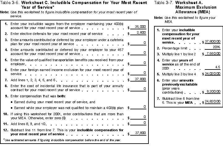 Jerry's employer has set up a 403(b) account for him. In this account, Jerry has chosen to invest 8% of his salary each year in mutual funds through payroll reductions. For 2001, this is $2,800. Jerry is not using an alternative limit on annual additions. Figure Jerry's years of service. The first thing Jerry will need to do is figure his years of service. In 1997, Jerry worked 1/2 of the year for his employer. For the years 1998 through 2001, Jerry has been a full-time employee for each of the hospital's entire annual work periods. Jerry's years of service at the end of 2001 total 4.5 years. Figure Jerry's includible compensation. The second thing for Jerry to figure is his includible compensation for his most recent year of service. Before he can do this, he must identify his most recent year of service. Jerry is a full-time employee who works the entire annual work period. Jerry's most recent year of service is 2001. Jerry figures his includible compensation as shown in Table 3-6. Figure Jerry's amounts previously excludable. Jerry's next step is to figure his amounts previously excludable. The 8% contributions made through a salary reduction agreement equal $9,200. Jerry's MEA. Using the figures for years of service, includible compensation, and amounts previously excludable, Jerry can now use Worksheet A to figure his MEA as shown in Table 3-7. Figuring Jerry's MACJerry's MEA for 2001 is $24,820. However, this is not the maximum amount that can be contributed to his 403(b) account. To determine his MAC, Jerry will need to figure his limit on annual additions (chapter 4) and his limit on elective deferrals (chapter 5).