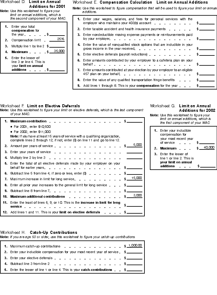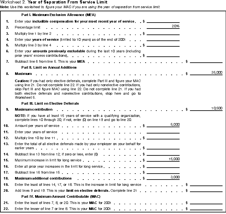 Checking the Previous Year's ContributionsAt the beginning of the following year, you should refigure your MAC based on your actual earned income. At the end of the current year or the beginning of the next year, you should check your contributions to be sure you did not exceed your MAC. This means refiguring your limit based on your actual compensation figures for the year. This will allow you to determine if the amount contributed is more than the allowable amounts, and possibly avoid additional taxes. Available WorksheetsThe following worksheets have been provided to help you figure components of your MAC.