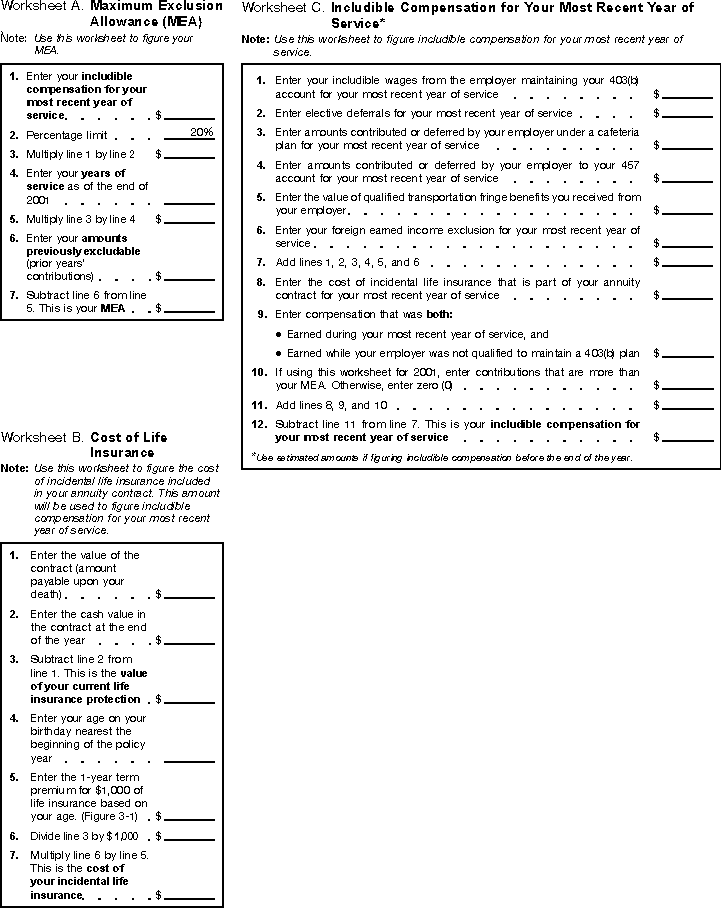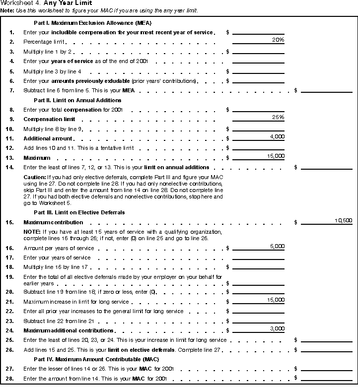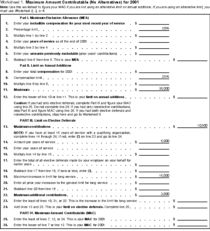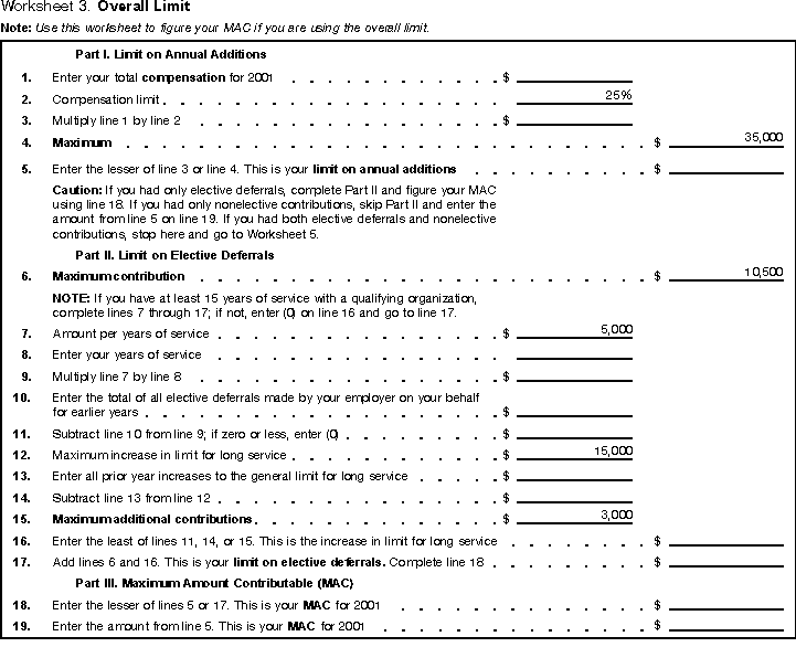 If your compensation is the same as, or more than, the projected amounts and the calculations are correct, then you should simply file these worksheets with your other tax records for the year. If your compensation was lower than your estimated figures, you will need to check the amount contributed during the year to determine if contributions are more than your MAC. When Should I Figure MAC?At the beginning of each year, you should figure your MAC using a conservative estimate of your compensation. Should your income change during the year, you should refigure your MAC based on a revised conservative estimate. By doing this, you will be able to determine if contributions to your 403(b) account should be increased or decreased for the year. Figuring MAC for the Current YearIf you are figuring your MAC for the current year, you should use a conservative estimate of your compensation. If you can figure your MAC for 2001 using one of the three alternative limits, you should figure your MAC using both the selected alternative limit and the general limit.