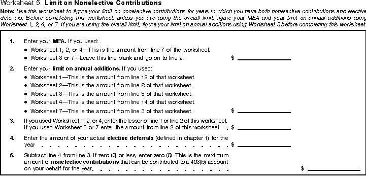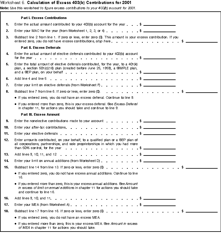 Worksheets 1 through 5, and 7 will help you figure MAC. Worksheet 6 will help your determine if you have excess contributions.