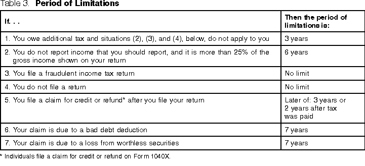 MicrofilmMicrofilm and microfiche reproductions of general books of accounts, such as cash books, journals, voucher registers, and ledgers, are accepted for recordkeeping purposes if they comply with Revenue Procedure 81-46. Revenue Procedure 81-46 is in Cumulative Bulletin 1981-2. Electronic Storage SystemRecords maintained in an electronic storage system are accepted for recordkeeping purposes if the system complies with Revenue Procedure 97-22. Revenue Procedure 97-22 is in Cumulative Bulletin 1997-1. An electronic storage system is one that either images hardcopy (paper) books and records or transfers computerized books and records to an electronic storage media, such as an optical disk. How Long To Keep RecordsYou must keep your records as long as they may be needed for the administration of any provision of the Internal Revenue Code. Generally, this means you must keep records that support an item of income or deduction on a return until the period of limitations for that return runs out. The period of limitations is the period of time in which you can amend your return to claim a credit or refund, or the IRS can assess additional tax. Table 3, below, contains the periods of limitations that apply to income tax returns. Unless otherwise stated, the years refer to the period after the return was filed. Returns filed before the due date are treated as filed on the due date.