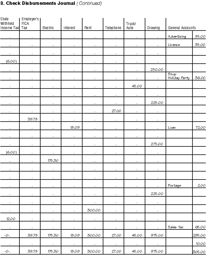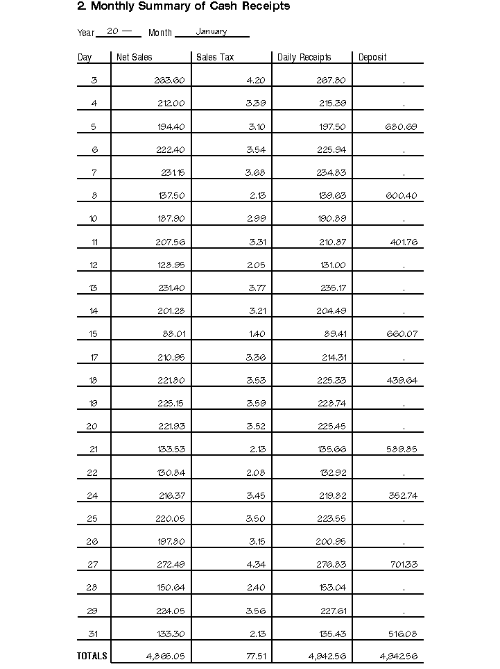 Keep copies of your filed tax returns. They help in preparing future tax returns and making computations if you later file an amended return. Employment taxes. If you have employees, you must keep all employment tax records for at least 4 years after the date the tax becomes due or is paid, whichever is later. Assets. Keep records relating to property until the period of limitations expires for the year in which you dispose of the property in a taxable disposition. You must keep these records to figure any depreciation, amortization, or depletion deduction, and to figure your basis for computing gain or loss when you sell or otherwise dispose of the property. Generally, if you received property in a nontaxable exchange, your basis in that property is the same as the basis of the property you gave up, increased by money you paid. You must keep the records on the old property, as well as on the new property, until the period of limitations expires for the year in which you dispose of the new property in a taxable disposition. Records for nontax purposes. When your records are no longer needed for tax purposes, do not discard them until you check to see if you have to keep them longer for other purposes. For example, your insurance company or creditors may require you to keep them longer than the IRS does. Sample Record SystemThis example illustrates a single-entry system used by Henry M. Brown, who is the sole proprietor of a small automobile body shop. Henry uses part-time help, has no inventory of items held for sale, and uses the cash method of accounting. These sample records should not be viewed as a recommendation of how to keep your records. They are intended to show how one business keeps its records. 1. Daily Summary of Cash Receipts (Page 18)This summary is a record of cash sales for the day. It accounts for cash at the end of the day over the amount in the Change and Petty Cash Fund at the beginning of the day. Henry takes the cash sales entry from his cash register tape. If he had no cash register, he would simply total his cash sale slips and any other cash received that day. He carries the total receipts shown in this summary for January 3 ($267.80), including cash sales ($263.60) and sales tax ($4.20), to the Monthly Summary of Cash Receipts. Petty cash fund. Henry uses a petty cash fund to make small payments without having to write checks for small amounts. Each time he makes a payment from this fund, he makes out a petty cash slip and attaches it to his receipt as proof of payment. He sets up a fixed amount ($50) in his petty cash fund. The total of the unspent petty cash and the amounts on the petty cash slips should equal the fixed amount of the fund. When the totals on the petty cash slips approach the fixed amount, he brings the cash in the fund back to the fixed amount by writing a check to "Petty Cash" for the total of the outstanding slips. (See the Check Disbursements Journal entry for check number 92.) This restores the fund to its fixed amount of $50. He then summarizes the slips and enters them in the proper columns in the monthly check disbursements journal. 2. Monthly Summary of Cash Receipts (Page 19)This shows the income activity for the month. Henry carries the total monthly net sales shown in this summary for January ($4,865.05) to his Annual Summary. To figure total monthly net sales, Henry reduces the total monthly receipts by the sales tax imposed on his customers and turned over to the state. He cannot take a deduction for sales tax turned over to the state because he only collected the tax. He does not include the tax in his income. 3. Check Disbursements Journal (Page 20)Henry enters checks drawn on the business checking account in the Check Disbursements Journal each day. All checks are prenumbered and each check number is listed and accounted for in the column provided in the journal. Frequent expenses have their own headings across the sheet. He enters in a separate column expenses that require comparatively numerous or large payments each month, such as materials, gross payroll, and rent. Under the General Accounts column, he enters small expenses that normally have only one or two monthly payments, such as licenses and postage. Henry does not pay personal or nonbusiness expenses by checks drawn on the business account. If he did, he would record them in the journal, even though he could not deduct them as business expenses. Henry carries the January total of expenses for materials ($1,083.50) to the Annual Summary. Similarly, he enters monthly total of expenses for telephone, truck, auto, etc., in the appropriate columns of that summary. 4. Employee Compensation Record (Page 22)This record shows the following information.