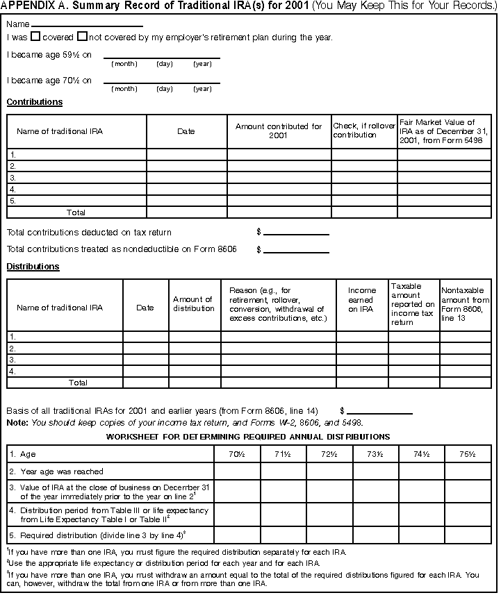 - Appendix A -- Summary Record of Traditional IRA(s) for 2001 and Worksheet For Determining Required Annual