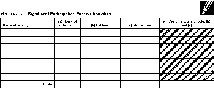 Worksheet A. Complete Worksheet A, Significant Participation Passive Activities (shown on the next page), if you have income or losses from any significant participation activity. Begin by entering the name of each activity in the left column. Column (a). Enter the number of hours you participated in each activity and total the column. If the total is more than 500, do not complete Worksheet A or B. None of the activities are passive activities because you satisfy test 4 for material participation. (See Material participation tests, earlier.) Report all the income and losses from these activities on the forms and schedules you normally use. Do not include the income and losses on Form 8582. Column (b). Enter the net loss, if any, from the activity. Net loss from an activity means either: