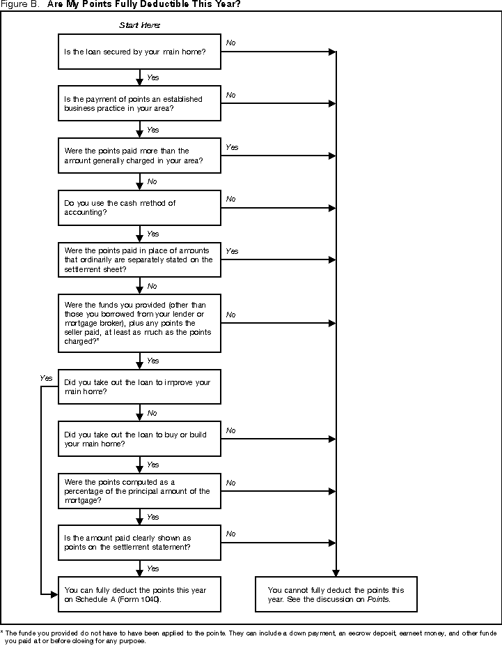 Payments made to end the lease and to buy the lessor's entire interest in the land are not ground rents. You cannot deduct them. Nonredeemable ground rent. Payments on a nonredeemable ground rent are not mortgage interest. You can deduct them as rent if they are a business expense or if they are for rental property. Rental payments. If you live in a house before final settlement on the purchase, any payments you make for that period are rent and not interest. This is true even if the settlement papers call them interest. You cannot deduct these payments as home mortgage interest. Mortgage proceeds invested in tax-exempt securities. You cannot deduct the home mortgage interest on grandfathered debt or home equity debt if you used the proceeds of the mortgage to buy securities or certificates that produce tax-free income. Grandfathered debt and home equity debt are defined in Part II of this publication. Refunds of interest. If you receive a refund of interest in the same year you paid it, you must reduce your interest expense by the amount refunded to you. If you receive a refund of interest you deducted in an earlier year, you generally must include the refund in income in the year you receive it. However, you need to include it only up to the amount of the deduction that reduced your tax in the earlier year. This is true whether the interest overcharge was refunded to you or was used to reduce the outstanding principal on your mortgage. If you need to include the refund in income, report it on line 21, Form 1040. If you received a refund of interest you overpaid in an earlier year, you generally will receive a Form 1098, Mortgage Interest Statement, showing the refund in box 3. For information about Form 1098, see Mortgage Interest Statement, later. For more information on how to treat refunds of interest deducted in earlier years, see Recoveries in Publication 525, Taxable and Nontaxable Income. Cooperative apartment owner. If you own a cooperative apartment, you must reduce your home mortgage interest deduction by your share of any cash portion of a patronage dividend that the cooperative receives. The patronage dividend is a partial refund to the cooperative housing corporation of mortgage interest it paid in a prior year. If you receive a Form 1098 from the cooperative housing corporation, the form should show only the amount you can deduct. PointsThe term "points" is used to describe certain charges paid, or treated as paid, by a borrower to obtain a home mortgage. Points may also be called loan origination fees, maximum loan charges, loan discount, or discount points. Figure B. Are My Points Fully Deductible This Year? A borrower is treated as paying any points that a home seller pays for the borrower's mortgage. See Points paid by the seller, later. General rule. You generally cannot deduct the full amount of points in the year paid. Because they are prepaid interest, you generally must deduct them over the life (term) of the mortgage. Exception. You can fully deduct points in the year paid if you meet all the following tests. (You can use Figure B as a quick guide to see whether your points are fully deductible in the year paid.)