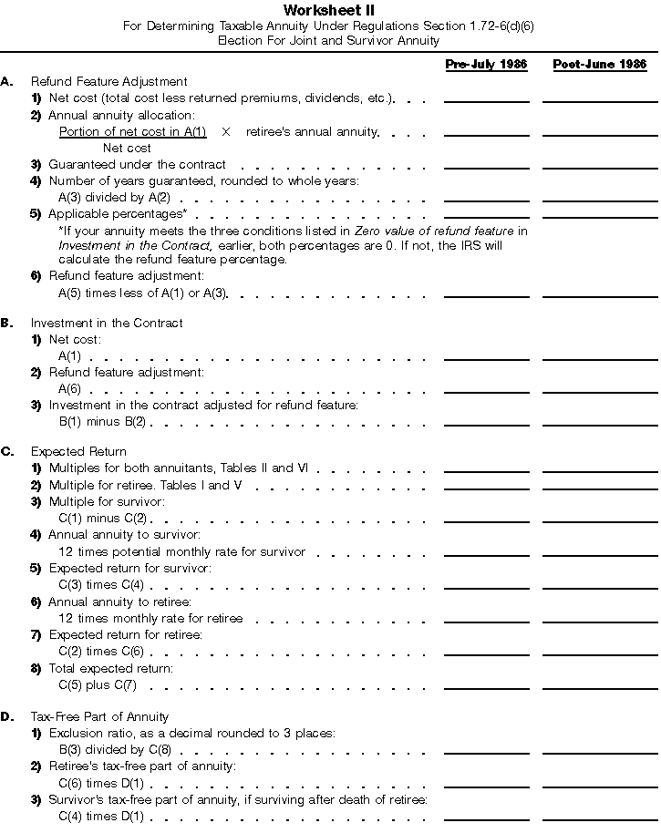 The tax-free part of Bill's total annuity is $1,920 ($1,896 plus $24). The taxable part of his annuity is $22,080 ($24,000 minus $1,920). If the annuity starting date is after 1986, the exclusion over the years cannot exceed the net cost (figured without any reduction for a refund feature). Example 2. Al Brown is age 62 at his nearest birthday to the annuity starting date. Al's wife is age 60 at her nearest birthday to the annuity starting date. The joint and survivor annuity pays $1,000 per month to Al for life, and $500 per month to Al's surviving wife after his death. The pre-July 1986 investment in the contract is $53,100 and the post-June 1986 investment in the contract is $7,000. Al makes the election described in Example 1. For purposes of this example, assume the refund feature adjustment is zero. If an adjustment is required, IRS will figure the amount. See Requesting a Ruling on Taxation of Annuity at the end of this publication.
