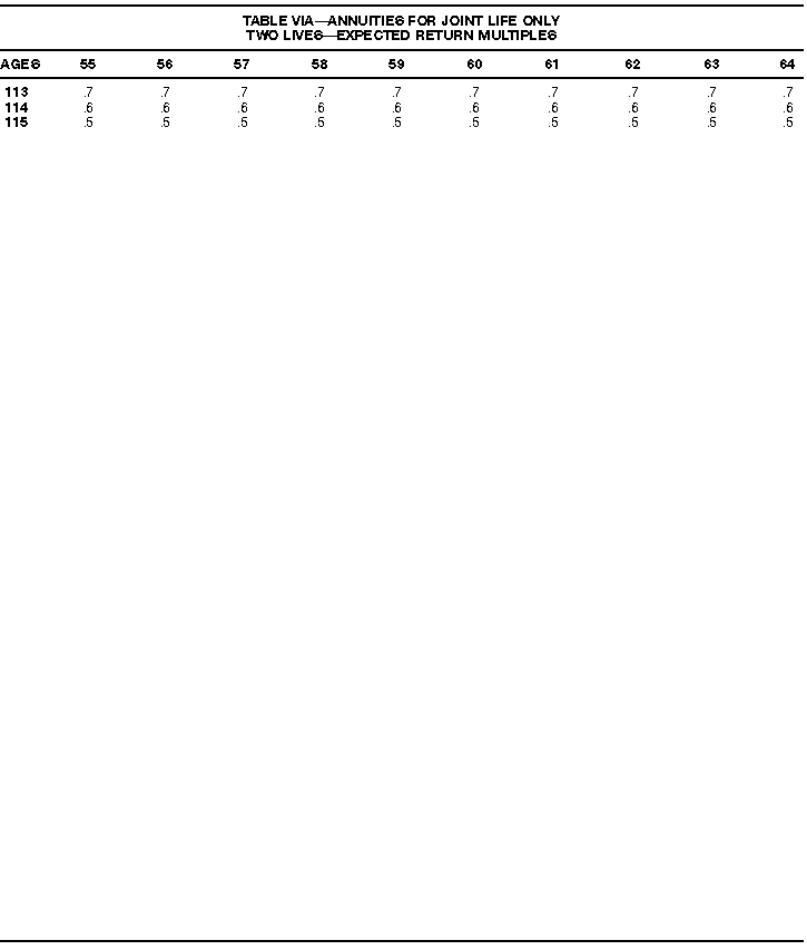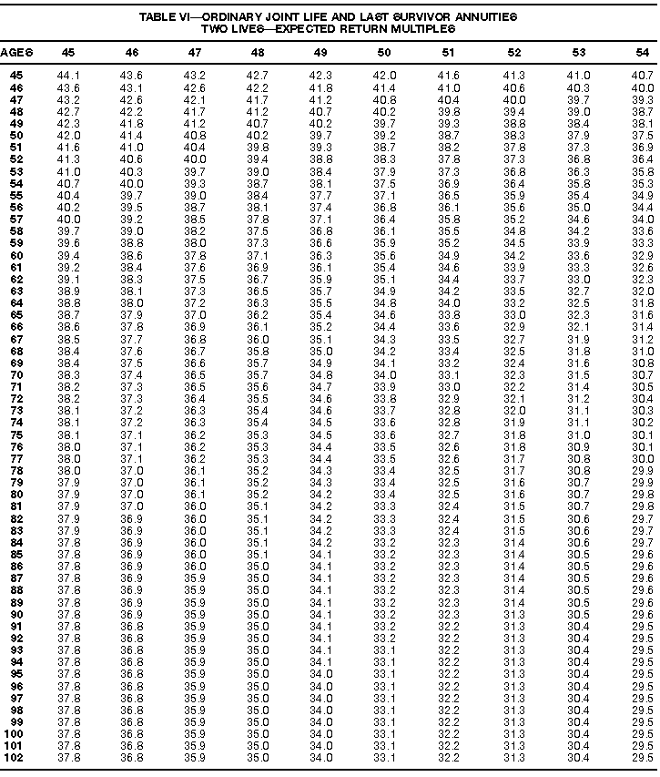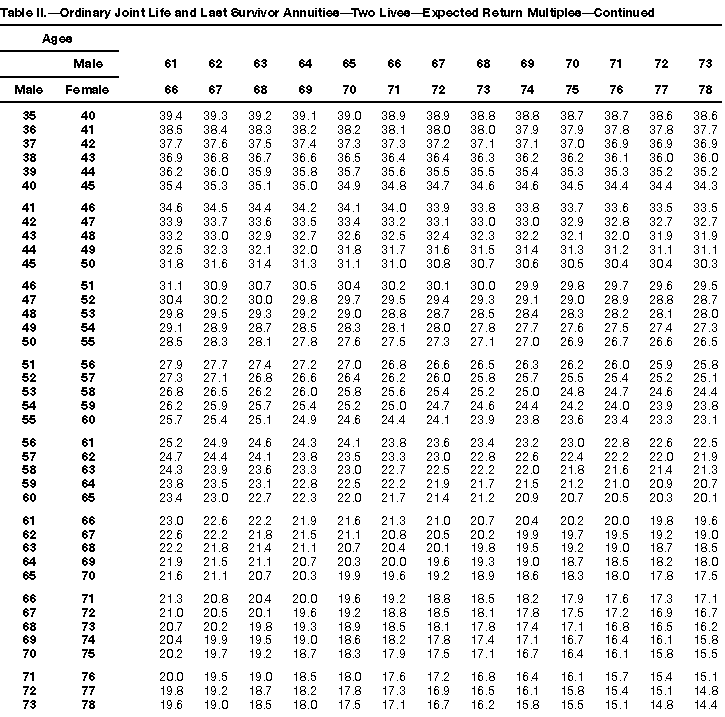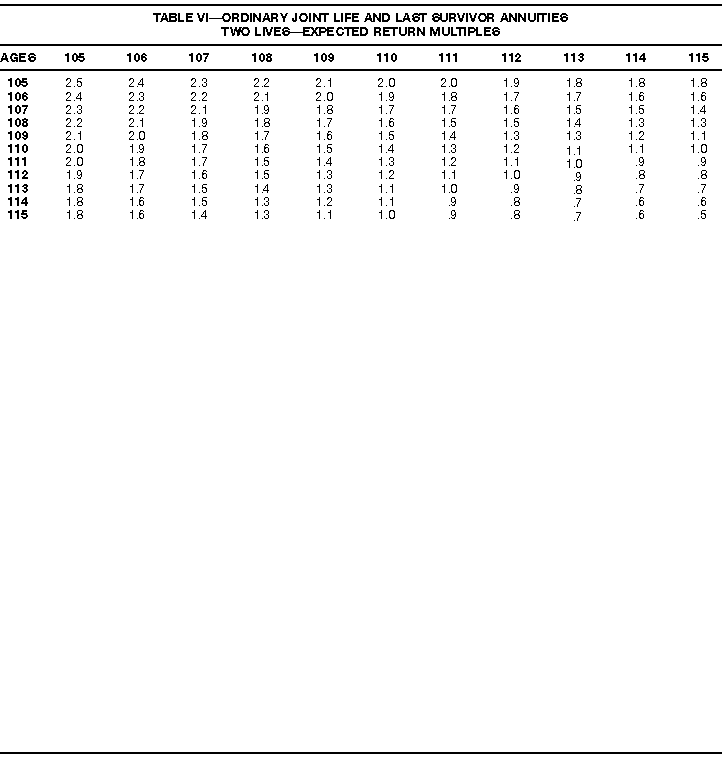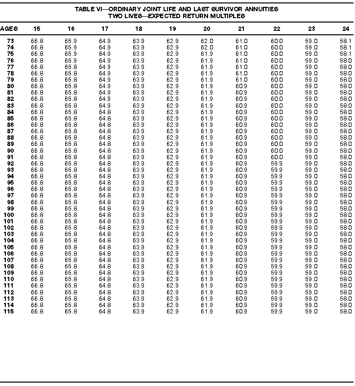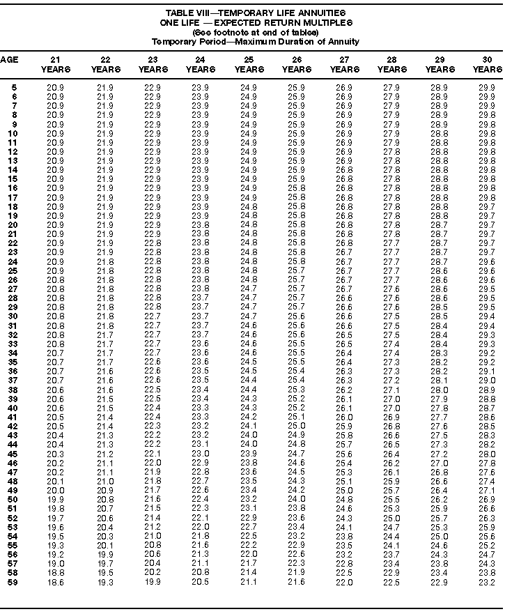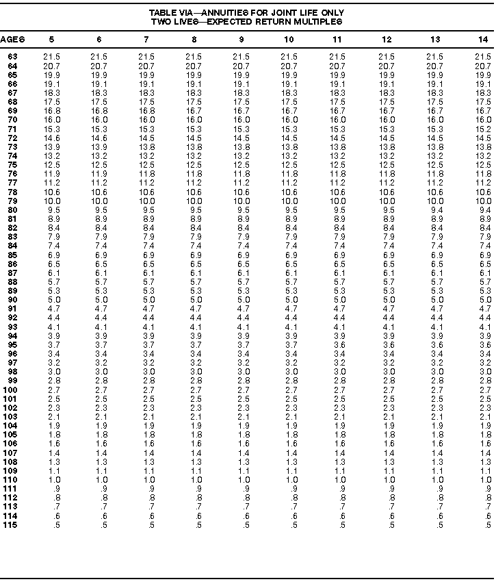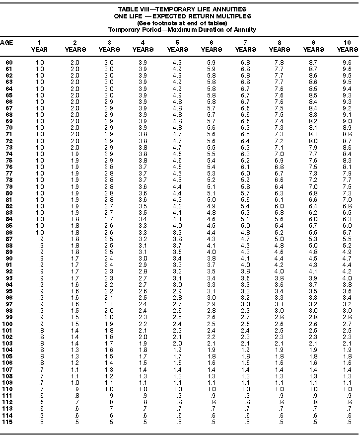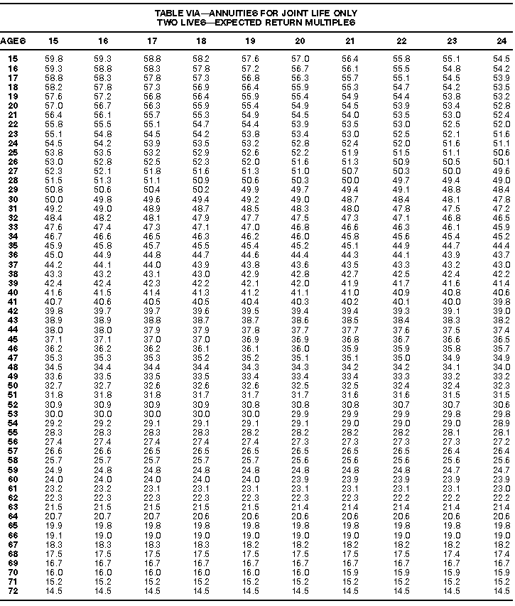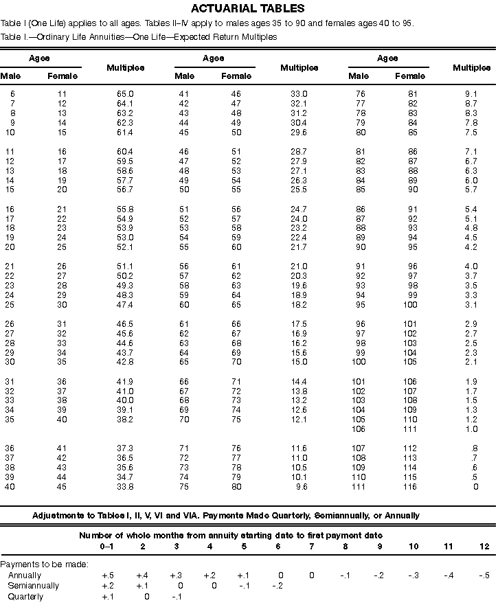 How To Use Actuarial TablesIn figuring, under the General Rule, the taxable part of your annuity payments that you are to get for the rest of your life (rather than for a fixed number of years), you must use one or more of the actuarial tables in this publication. Unisex Annuity TablesEffective July 1, 1986, the Internal Revenue Service adopted new annuity Tables V through VIII, in which your sex is not considered when determining the applicable factor. These tables correspond to the old Tables I through IV. In general, Tables V through VIII must be used if you made contributions to the retirement plan after June 30, 1986. If you made no contributions to the plan after June 30, 1986, generally you must use only Tables I through IV. However, if you received an annuity payment after June 30, 1986, you may elect to use Tables V through VIII (see Annuity received after June 30, 1986, later). Special ElectionsAlthough you generally must use Tables V through VIII if you made contributions to the retirement plan after June 30, 1986, and Tables I through IV if you made no contributions after June 30, 1986, you can make the following special elections to select which tables to use. Contributions made both before July 1986 and after June 1986. If you made contributions to the retirement plan both before July 1986 and after June 1986, you may elect to use Tables I through IV for the pre-July 1986 cost of the contract, and Tables V through VIII for the post-June 1986 cost. (See the examples below.) Making the election. Attach this statement to your income tax return for the first year in which you receive an annuity: "I elect to apply the provisions of paragraph (d) of section 1.72-6 of the Income Tax Regulations." The statement must also include your name, address, social security number, and the amount of the pre-July 1986 investment in the contract.