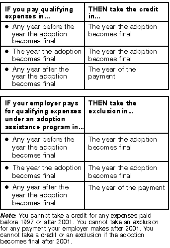 After 2001, the amount of your allowable adoption credit for a year cannot be more than your regular tax for that year reduced by your tentative minimum tax (determined without regard to the AMT foreign tax credit), minus the amounts listed in (2) through (6). When To Take the Credit or ExclusionWhen you can take the adoption credit or exclusion depends on whether the eligible child is a citizen or resident of the United States (including U.S. possessions) at the time the adoption effort begins. Child who is a U.S. citizen or resident. If the eligible child is a U.S. citizen or resident, you can take the adoption credit or exclusion even if the adoption never becomes final. Take the credit or exclusion as shown in the following tables.