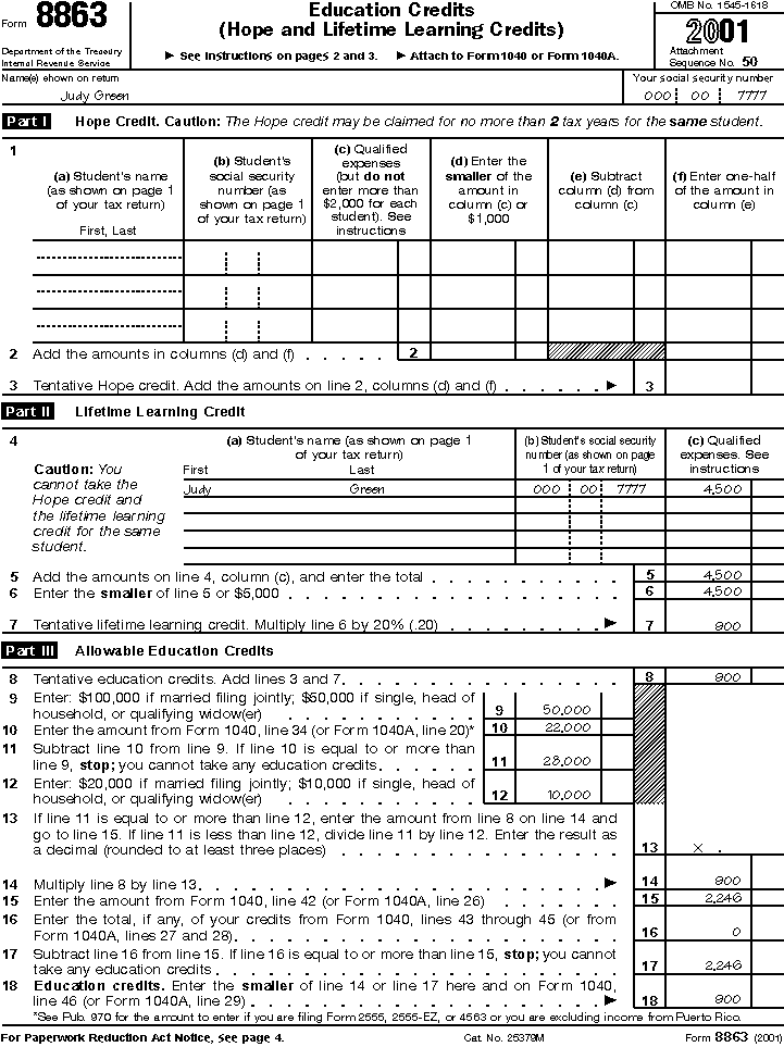 Illustrated ExampleJudy Green, a single taxpayer, is taking courses at a community college to be recertified to teach in public schools. Her modified adjusted gross income is $22,000. Her tax is $2,246. In July 2001 she pays $700 for the summer 2001 semester; in August 2001 she pays $1,900 for the fall 2001 semester; and in December 2001 she pays another $1,900 for the winter semester. Judy and the college meet all the requirements for the lifetime learning credit. She can use all of the $4,500 tuition she paid in 2001 when figuring her credit for her 2001 tax return. She figures her credit as shown on the filled-in Form 8863 on the next page. Note. In Appendix A at the end of this publication, there is an example illustrating the use of Form 8863 when the Hope credit and the lifetime learning credit are both claimed on the same tax return. |