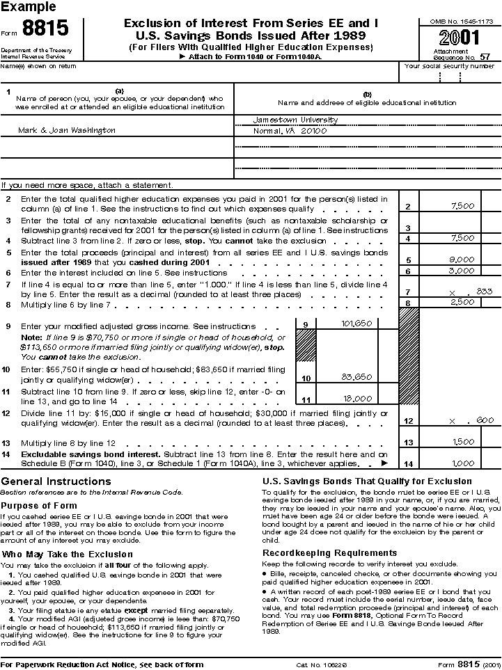How Is the Tax-Free Amount Figured?If the total you receive when you cash in the bonds is not more than the qualified higher education expenses for the year, all of the interest on the bonds may be tax free. If the total you receive when you cash in the bonds is more than the expenses, part of the interest may be tax free. To determine the tax-free amount, multiply the interest part of the proceeds by a fraction. The numerator (top part) of the fraction is the qualified higher education expenses you paid during the year. The denominator (bottom part) of the fraction is the total proceeds you received during the year. Example 1. In February 2001, Mark and Joan, a married couple, cashed a qualified series EE U.S. savings bond they bought in November 1992. They received proceeds of $9,000, representing principal of $6,000 and interest of $3,000. In 2001, they paid $7,500 of their daughter's college tuition. They are not claiming an education credit for that amount, and they do not have a Coverdell ESA (formerly known as an education IRA). Their modified adjusted gross income for 2001 was $80,000. They can exclude $2,500 ($3,000 × ($7,500 ÷ $9,000)) of interest in 2001. They must pay tax on the remaining $500 ($3,000 - $2,500) interest. Does the Amount of Your Income Affect the Amount of Your Exclusion?The amount of your interest exclusion is gradually reduced (phased out) if your modified adjusted gross income is between $55,750 and $70,750 (between $83,650 and $113,650 for joint returns). You cannot exclude any of the interest if your modified adjusted gross income is equal to or more than the upper limit. The phaseout, if any, is figured for you when you fill out Form 8815. Illustrated Example. The information is the same as in the previous example except that Mark and Joan have a modified adjusted gross income of $101,650. In this example, they can exclude $1,000 (line 14 of Form 8815 shown on the next page) of interest in 2001. They must pay tax on the remaining $2,000 interest ($3,000 total interest minus $1,000 excluded interest). How Is the Exclusion Claimed?Use Form 8815 to figure your education savings bond interest exclusion. Attach the form to your Form 1040 or 1040A.
