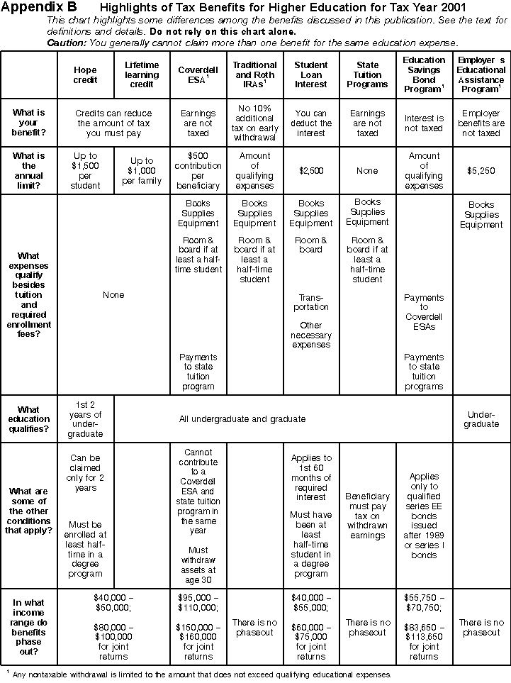 AppendicesThe following appendices include an illustrated example of how to use the Form 8863 when claiming both education tax credits at the same time and a chart reflecting some of the major differences between the many tax benefits for higher education that are outlined in this publication.