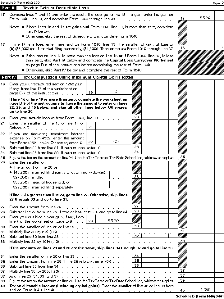 Comprehensive ExampleEmily Jones is single and, in addition to wages from her job, she has income from stocks and other securities. For the 2001 tax year, she had the following capital gains and losses, which she reports on Schedule D. All the Forms 1099 she received showed net sales prices. Her filled-in Schedule D is shown in this chapter. Capital gains and losses -- Schedule D. Emily sold stock in two different companies that she held for less than a year. In June, she sold 100 shares of Trucking Co. stock that she had bought in February. She had an adjusted basis of $650 in the stock and sold it for $900, for a gain of $250. In July, she sold 25 shares of Computer Co. stock that she bought in June. She had an adjusted basis in the stock of $2,500 and she sold it for $2,000, for a loss of $500. She reports these short-term transactions on line 1 in Part I of Schedule D. Emily had three other stock sales that she reports as long-term transactions on line 8 in Part II of Schedule D. In February, she sold 60 shares of Car Co. for $2,100. She had inherited the Car Co. stock from her father. Its fair market value at the time of his death was $2,500, which became her basis. Her loss on the sale is $400. Because she had inherited the stock, her loss is a long-term loss, regardless of how long she and her father actually held the stock. She enters the loss in column (f) of line 8. In June, she sold 500 shares of Furniture Co. stock for $14,000. She had bought 100 of those shares in 1990, for $1,000. She had bought 100 more shares in 1992 for $2,200, and an additional 300 shares in 1995 for $1,500. Her total basis in the stock is $4,700. She has a $9,300 ($14,000 - $4,700) gain on this sale, which she enters in column (f) of line 8. Because she held all 500 shares for more than 5 years, the entire gain is qualified 5-year gain. In December, she sold 20 shares of Toy Co. for $4,100. This was qualified small business stock that she had bought in September 1996. Her basis is $1,100, so she has a $3,000 gain which she enters in column (f) of line 8. Because she held the stock more than 5 years, she has a $1,500 section 1202 exclusion. She enters that amount in column (g) as a 28% rate gain and claims the exclusion on the line below by entering $1,500 as a loss in column (f). She received a Form 1099-B (not shown) from her broker for each of these transactions. Capital loss carryover from 2000. Emily has a capital loss carryover to 2001 of $800, of which $300 is short-term capital loss, and $500 is long-term capital loss. She enters these amounts on lines 6 and 14 of Schedule D. She kept the completed Capital Loss Carryover Worksheet in her 2000 Schedule D instructions (not shown), so she could properly report her loss carryover for the 2001 tax year without refiguring it. Tax computation. Because Emily has gains on both lines 16 and 17 of Schedule D and has taxable income, she goes to Part IV of Schedule D to figure her tax. But because line 15 of Schedule D is more than zero (due to her section 1202 gain from selling qualified small business stock), she must use the Schedule D Tax Worksheet to figure her tax instead. She must also complete the Qualified 5-Year Gain Worksheet (not shown) in her Schedule D instructions. After entering the gain from line 17 on line 13 of her Form 1040, she completes the rest of Form 1040 through line 39. She enters the amount from that line, $30,000, on line 1 of the Schedule D Tax Worksheet. After filling out the worksheet and the rest of that worksheet, she figures her tax is $4,235. This is less than the $4,876 tax she would have figured without the capital gain tax rates. Reconciliation of Forms 1099-B. Emily makes sure that the total of the amounts reported in column (d) of lines 3 and 10 of Schedule D is not less than the total of the amounts shown on the Forms 1099-B she received from her broker. For 2001, the total of each is $23,100. ScheduleSchedules (Form 1040): D D, page 1