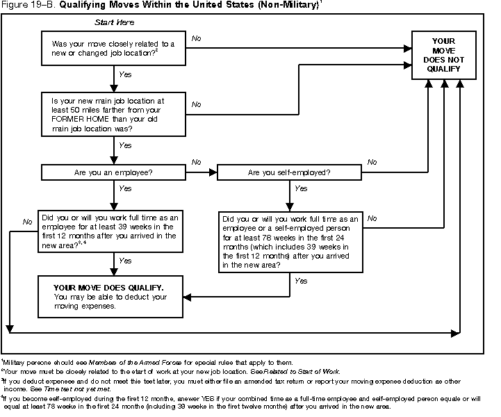 Who Can Deduct Moving ExpensesYou can deduct your allowable moving expenses if your move is closely related to the start of work. You also must meet the distance test and the time test. These two tests are discussed later. After you have read the distance and time test rules, you may want to use Figure 19-B to help you decide if your move qualifies. Related to Start of WorkYour move must be closely related, both in time and in place, to the start of work at your new job location. Closely related in time. You can generally consider moving expenses incurred within 1 year from the date you first reported to work at the new location as closely related in time to the start of work. It is not necessary that you arrange to work before moving to a new location, as long as you actually do go to work. If you do not move within 1 year of the date you begin work, you ordinarily cannot deduct the expenses unless you can show that circumstances existed that prevented the move within that time. Example. Your family moved more than a year after you started work at a new location. You delayed the move for 18 months to allow your child to complete high school. You can deduct your allowable moving expenses. Closely related in place. You can generally consider your move closely related in place to the start of work if the distance from your new home to the new job location is not more than the distance from your former home to the new job location. A move that does not meet this requirement may qualify if you can show that: