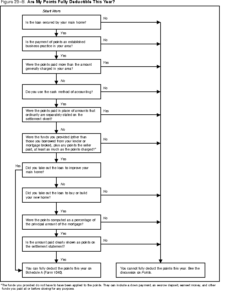 The dollar limits for the second and third categories apply to the combined mortgages on your main home and second home. See Part II of Publication 936 for more detailed definitions of grandfathered, home acquisition, and home equity debt. You can use Figure 25-A to check whether your home mortgage interest is fully deductible. Figure 25-A. Is My Interest Fully Deductible? Limits on deduction. You cannot fully deduct interest on a mortgage that does not fit into any of the three categories listed above. If this applies to you, see Part II of Publication 936 to figure the amount of interest you can deduct. Special SituationsThis section describes certain items that can be included as home mortgage interest and others that cannot. It also describes certain special situations that may affect your deduction. Late payment charge on mortgage payment. You can deduct as home mortgage interest a late payment charge if it was not for a specific service performed in connection with your mortgage loan. Mortgage prepayment penalty. If you pay off your home mortgage early, you may have to pay a penalty. You can deduct that penalty as home mortgage interest provided the penalty is not for a specific service performed or cost incurred in connection with your mortgage loan. Sale of home. If you sell your home, you can deduct your home mortgage interest (subject to any limits that apply) paid up to, but not including, the date of sale. Example. John and Peggy Harris sold their home on May 7. Through April 30, they made home mortgage interest payments of $1,220. The settlement sheet for the sale of the home showed $50 interest for the 6-day period in May up to, but not including, the date of sale. Their mortgage interest deduction is $1,270 ($1,220 + $50). Prepaid interest. If you pay interest in advance for a period that goes beyond the end of the tax year, you must spread this interest over the tax years to which it applies. You can deduct in each year only the interest that qualifies as home mortgage interest for that year. However, see Points, later. Mortgage interest credit. You may be able to claim a mortgage interest credit if you were issued a mortgage credit certificate (MCC) by a state or local government. Figure the credit on Form 8396, Mortgage Interest Credit. If you take this credit, you must reduce your mortgage interest deduction by the amount of the credit. For more information on the credit, see chapter 38. Ministers' and military housing allowance. If you are a minister or a member of the uniformed services and receive a housing allowance that is not taxable, you can still deduct your home mortgage interest. Mortgage assistance payments. If you qualify for mortgage assistance payments under section 235 of the National Housing Act, part or all of the interest on your mortgage may be paid for you. You cannot deduct the interest that is paid for you. No other effect on taxes. Do not include these mortgage assistance payments in your income. Also, do not use these payments to reduce other deductions, such as real estate taxes. Divorced or separated individuals. If a divorce or separation agreement requires you or your spouse or former spouse to pay home mortgage interest on a home owned by both of you, the payment of interest may be alimony. See the discussion of Payments for jointly-owned home in chapter 20. Redeemable ground rent. If you make annual or periodic rental payments on a redeemable ground rent, you can deduct them as mortgage interest. Payments made to end the lease and to buy the lessor's entire interest in the land are not ground rents. You cannot deduct them. For more information, see Publication 936. Nonredeemable ground rent. Payments on a nonredeemable ground rent are not mortgage interest. You can deduct them as rent if they are a business expense or if they are for rental property. Rental payments. If you live in a house before final settlement on the purchase, any payments you make for that period are rent and not interest. This is true even if the settlement papers call them interest. You cannot deduct these payments as home mortgage interest. Mortgage proceeds invested in tax-exempt securities. You cannot deduct the home mortgage interest on grandfathered debt or home equity debt if you used the proceeds of the mortgage to buy securities or certificates that produce tax-free income. Grandfathered debt and home equity debt are defined earlier under Amount Deductible. Refunds of interest. If you receive a refund of interest in the same tax year you paid it, you must reduce your interest expense by the amount refunded to you. If you receive a refund of interest you deducted in an earlier year, you generally must include the refund in income in the year you receive it. However, you need to include it only up to the amount of the deduction that reduced your tax in the earlier year. This is true whether the interest overcharge was refunded to you or was used to reduce the outstanding principal on your mortgage. If you received a refund of interest you overpaid in an earlier year, you generally will receive a Form 1098, Mortgage Interest Statement, showing the refund in box 3. For information about Form 1098, see Mortgage Interest Statement, later. For more information on how to treat refunds of interest deducted in earlier years, see Recoveries in chapter 13. PointsThe term "points" is used to describe certain charges paid, or treated as paid, by a borrower to obtain a home mortgage. Points may also be called loan origination fees, maximum loan charges, loan discount, or discount points. A borrower is treated as paying any points that a home seller pays for the borrower's mortgage. See Points paid by the seller, later. General rule. You generally cannot deduct the full amount of points in the year paid. Because they are prepaid interest, you generally must deduct them over the life (term) of the mortgage. Exception. You can fully deduct points in the year paid if you meet a