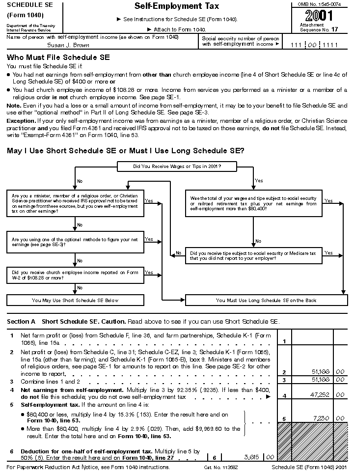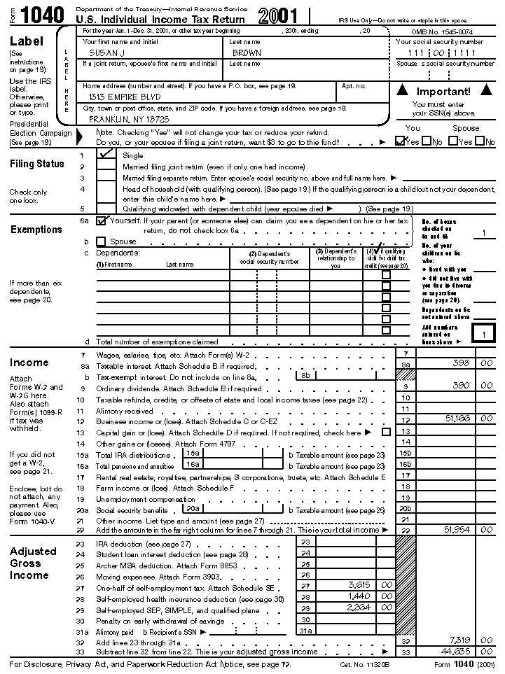 Page 1 of Form 1040 for Susan J. Brown Page 2 of Form 1040 for Susan J. Brown Page 1 of Schedule C (Form 1040) for Susan J. Brown Page 2 of Schedule C (Form 1040) for Susan J. Brown Page 1 of Schedule SE (Form 1040) for Susan J. Brown |