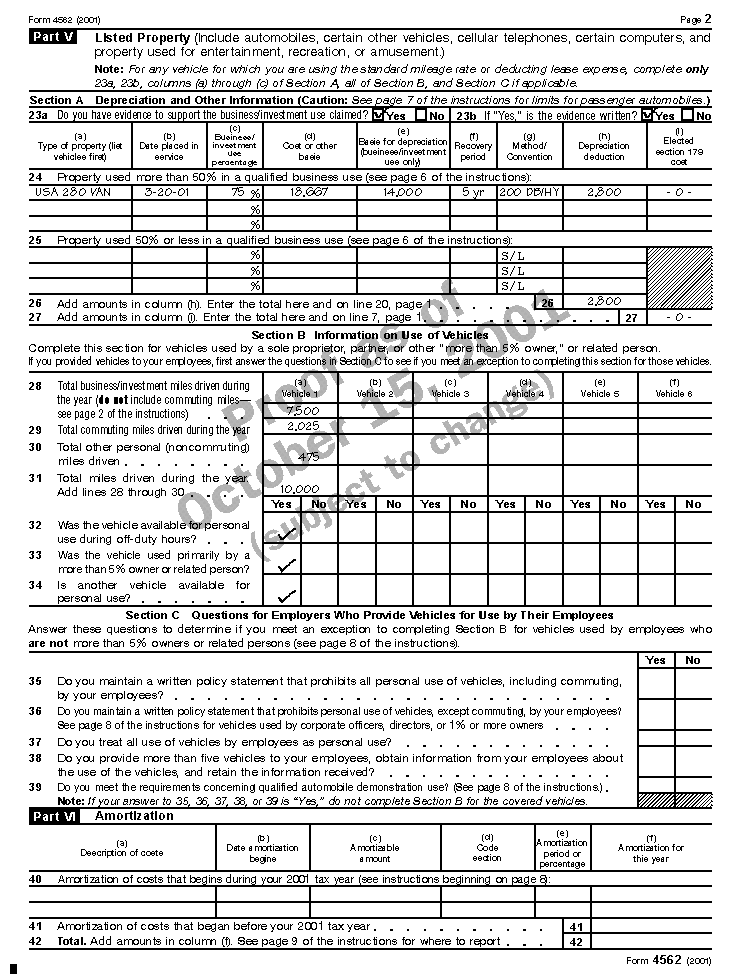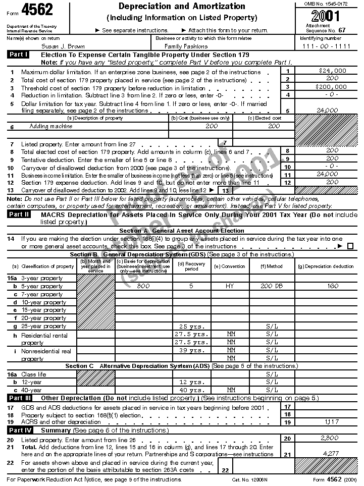 Preparing the Return for Susan J. BrownSusan J. Brown owns and operates Family Fashions, a ready-to-wear clothing shop. She uses an accrual method of accounting and files her return on a calendar year basis. Five employees worked in her shop during the year. She filed all the necessary employment tax forms and made the required tax deposits. See Publication 15, Circular E, Employer's Tax Guide. Schedule CFirst, Susan fills in the information required at the top of Schedule C. She starts by entering her name and social security number. Then she completes lines A through H. Line A. She enters her principal business. Line B. She enters 448140, which is the 6-digit business code for a family clothing shop. She found the code on page C-8 of the instructions for Schedule C. Susan locates the major business category that describes her business. She reads down the items under "Retail Trade" to find 448140--"Family clothing stores." Line C. She enters the name of her business--"Family Fashions." Line D. She enters her employer identification number (EIN). She has to have an EIN because she has employees. For information about EINs, see Identification Numbers in chapter 1. Line E. She enters her business address. Line F. She checks box 2 for accrual method of accounting. Line G. Susan checks "Yes" because she materially participated in her business during the year. The material participation rules are explained in the instructions for Schedule C. Line H. She leaves the box blank because she did not start or acquire her business during the year. Part I--Income and Part III--Cost of Goods SoldSusan enters items of income in Part I. Line 1. Susan enters her total sales of $397,742 for the year. Line 2. She enters the refunds she gave on merchandise her customers returned, as well as other adjustments she made to customers' purchases. They total $1,442. Line 4. Susan uses Part III on page 2 of Schedule C to figure her cost of goods sold. Part III, line 35. Her inventory at the beginning of the year, $42,843, is the same as her inventory at the end of last year. This figure matches the amount on Part III, line 41, of her last year's Schedule C. Part III, line 36. The total cost of goods she bought to sell to customers, minus the cost of the goods she returned to her suppliers, was $241,026. From this stock, she withdrew clothing and accessories for her own use that cost $774. She subtracts the cost of these items from her total purchases to figure net purchases of $240,252. Part III, line 40. She adds her net purchases to her beginning inventory. This sum is the total goods Susan had available for sale during the year. Part III, line 41. Susan's inventory at the end of the year was $43,746. Part III, line 42. Susan subtracts her inventory at the end of the year (line 41) from the goods that were available for sale (line 40) to get the cost of goods sold during the year. For more information on inventories, see chapter 2. For more information on cost of goods sold, see chapter 6. Line 5. Susan's gross profit, $156,951, is the difference between her net sales (line 3) and the cost of goods sold (line 4). Line 7. Because Susan did not have any income to report on line 6, the gross income is the same as the gross profit (line 5). Part II--ExpensesSusan enters her expense items in Part II. Line 8. Susan paid $3,500 for ads. Line 9. During the year, Susan determined that she would not be able to collect $479 from bad checks and deducted this amount as bad debts. See Bad Debts in chapter 8. Line 10. She used her van 75% for business during the year. She spent a total of $3,000 for gas and oil. She can deduct 75% of $3,000 or $2,250 for gas and oil. Other van expenses include $713 (75% of $950) for insurance, $812 (75% of $1,083) for repairs and upkeep, and $75 (75% of $100) for tags. She enters the total, $3,850, on line 10. See Car and Truck Expenses in chapter 8. Line 13. Susan enters the $4,277 depreciation from Form 4562, discussed later. Line 15. Susan's $238 deduction is for insurance on her business property (van insurance is included in line 10). The deduction is only for premiums that give her coverage for the year. See Insurance in chapter 8. Line 16b. Susan had borrowed money to use in her business. The interest on these loans was $2,633 for the year. See Interest in chapter 8. Line 18. The $216 Susan paid for postage during the year is her only office expense. Line 20b. Her rent for the store was $1,000 a month, or $12,000 for the year. See Rent Expense in chapter 8. Line 21. She had her store counters refinished and other painting done at a total cost of $964. Line 22. She spent $1,203 on supplies. Line 23. Susan renewed her business license and paid property tax on her store fixtures. She also paid the employer's share of social security and Medicare taxes for her employees and paid state and federal unemployment taxes. She enters the total of all these taxes, $5,727, on this line. See Taxes in chapter 8. Line 25. Susan's total expense for heat, light, and telephone for the year is $3,570. Line 26. Susan paid her employees a total of $59,050 for the year. She does not include in wages any amounts she paid to herself or withdrew from the business for her own use. See Employees' Pay in chapter 8. Line 27. Susan enters the total of her other business expenses on this line. These expenses are not included on lines 8-26. She lists the type and amount of the expenses separately in Part V of page 2, and carries the total entered on line 48 to line 27. See chapter 8 for expenses you can or cannot deduct. Line 28. Susan adds all her deductions listed in Part II and enters the total on this line. Line 29. She subtracts her total deductions (line 28) from her gross income (line 7). Susan has a tentative profit of $51,166. Line 30. Susan did not use any part of her home for business, so she does not make an entry here. For information about business use of the home, see Business Use of Your Home in chapter 