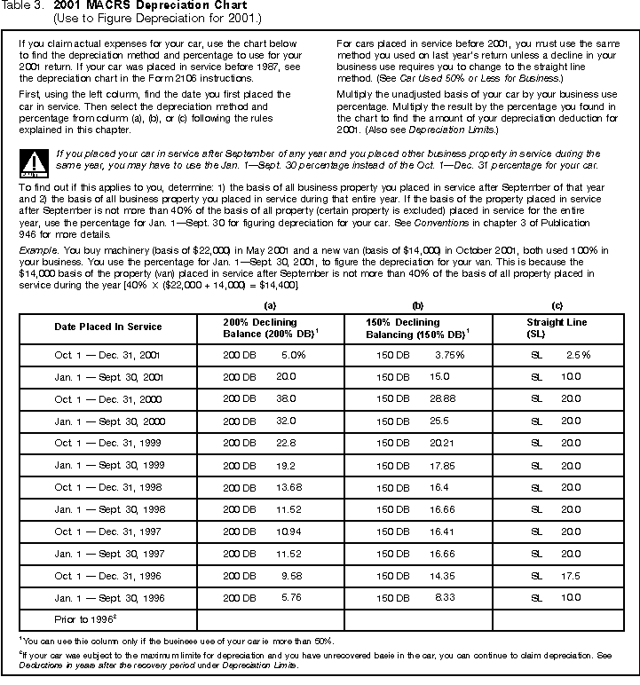 MACRS depreciation chart. A 2001 MACRS Depreciation Chart and instructions are included in this chapter as Table 3. Using this table will make it easy for you to figure the 2001 depreciation deduction for your car. A similar chart appears in the Instructions for Form 2106.