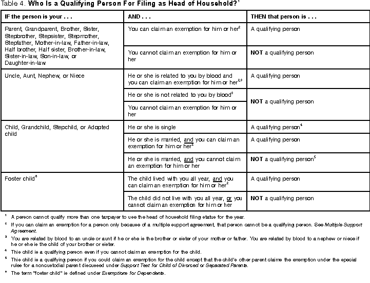 Qualifying PersonSee Table 4 to see who is a qualifying person. Any person not described in Table 4 is not a qualifying person. Home of qualifying person. Generally, the qualifying person must live with you for more than half of the year. Special rule for parent. You may be eligible to file as head of household even if the parent for whom you can claim an exemption does not live with you. You must pay more than half the cost of keeping up a home that was the main home for the entire year for your father or mother. You are keeping up a main home for your father or mother if you pay more than half the cost of keeping your parent in a rest home or home for the elderly.